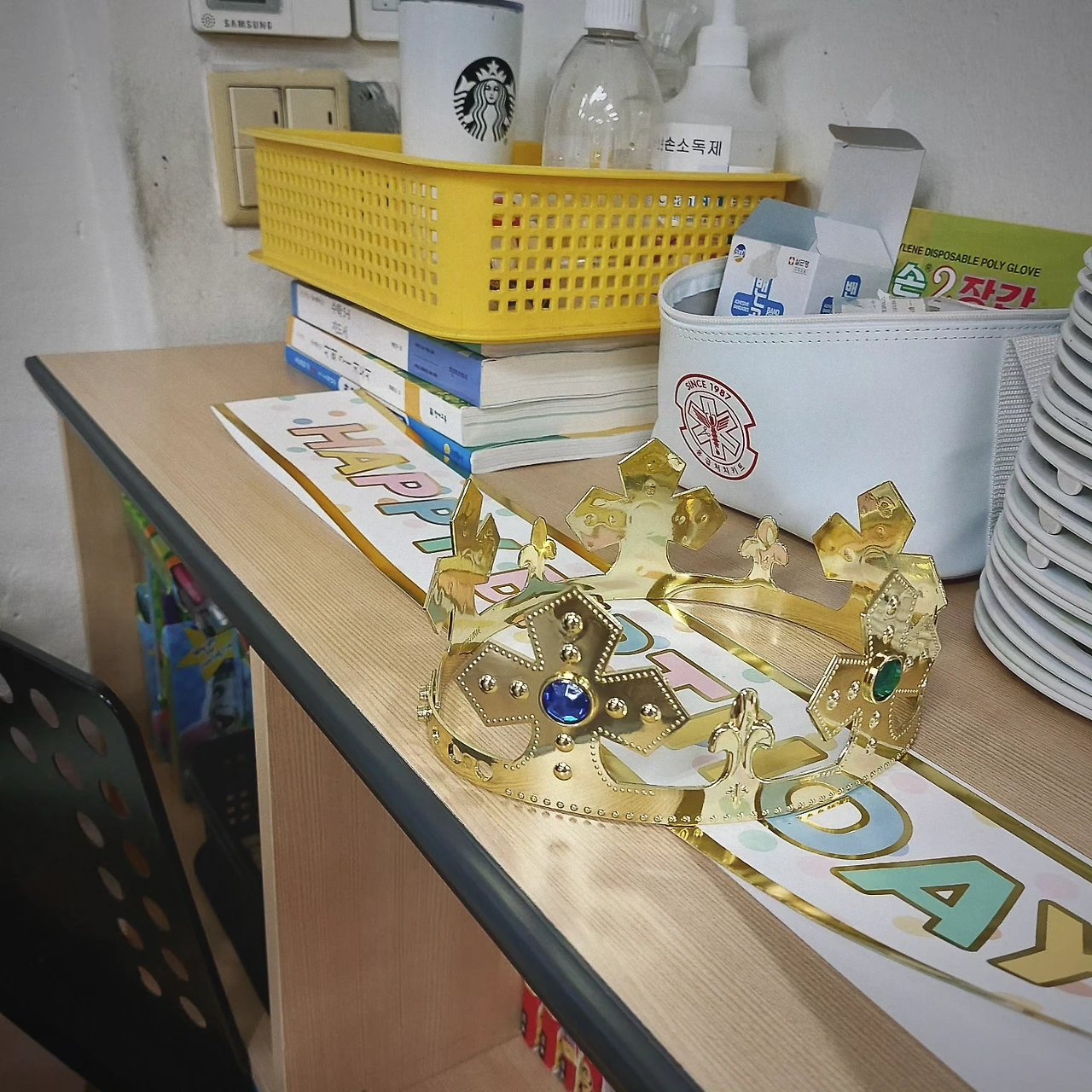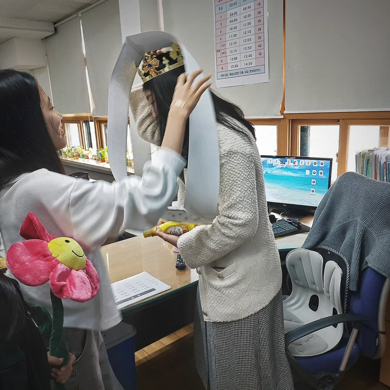 운 좋게도 담임쌤께 황금 왕관과 어깨띠, 그리고 빨간 꽃까지 선물하는 아이들의 모습을 사진으로 담을 수 있었다! 순간포착 대성공!