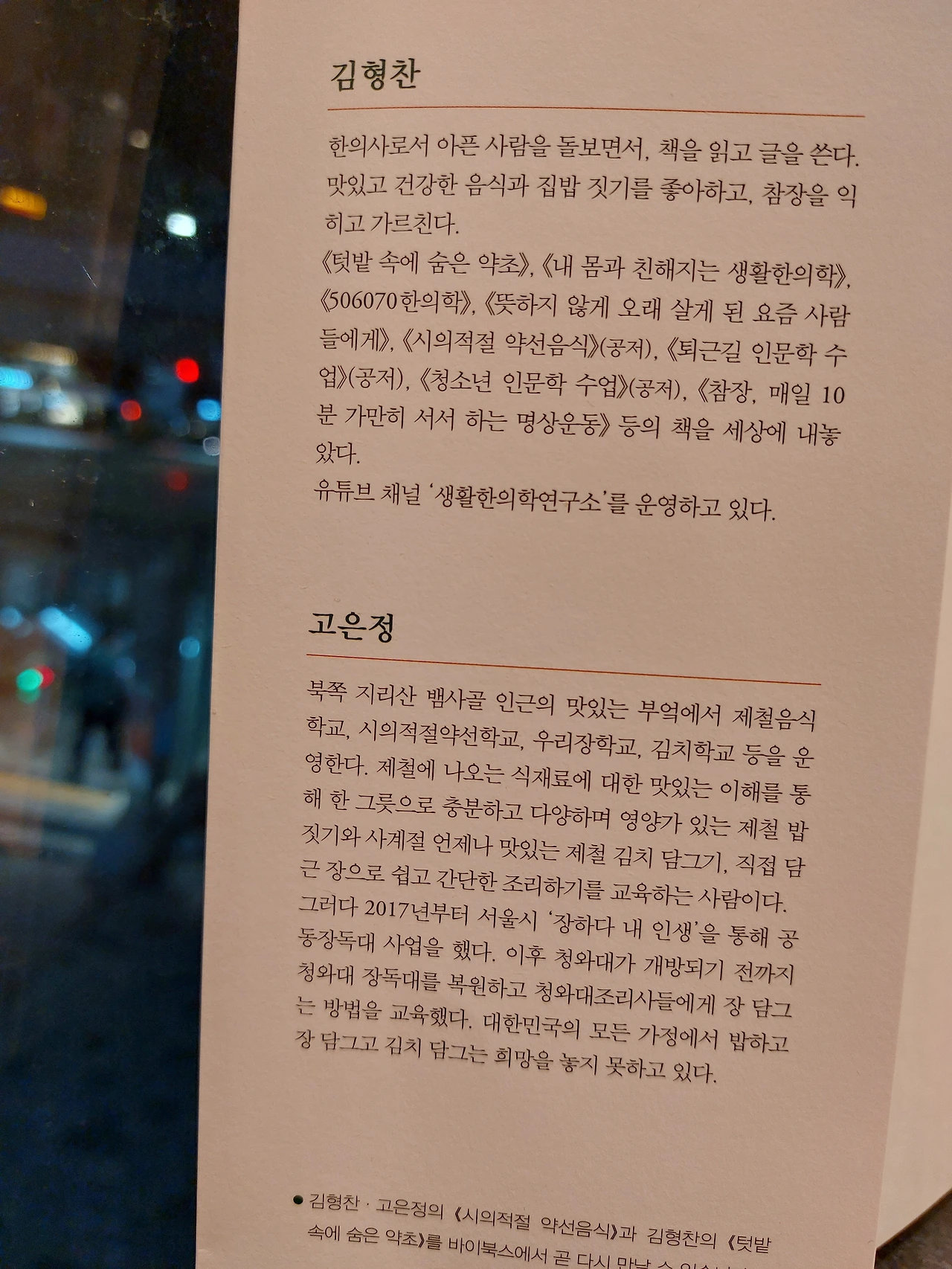 어라! 저자가 두 분이다. 김원장님은 건강 파트, 제철음식 전문가 고은정 님은 식생활 파트. 두 분이 공동집필이시군? 오호! 신선한데?