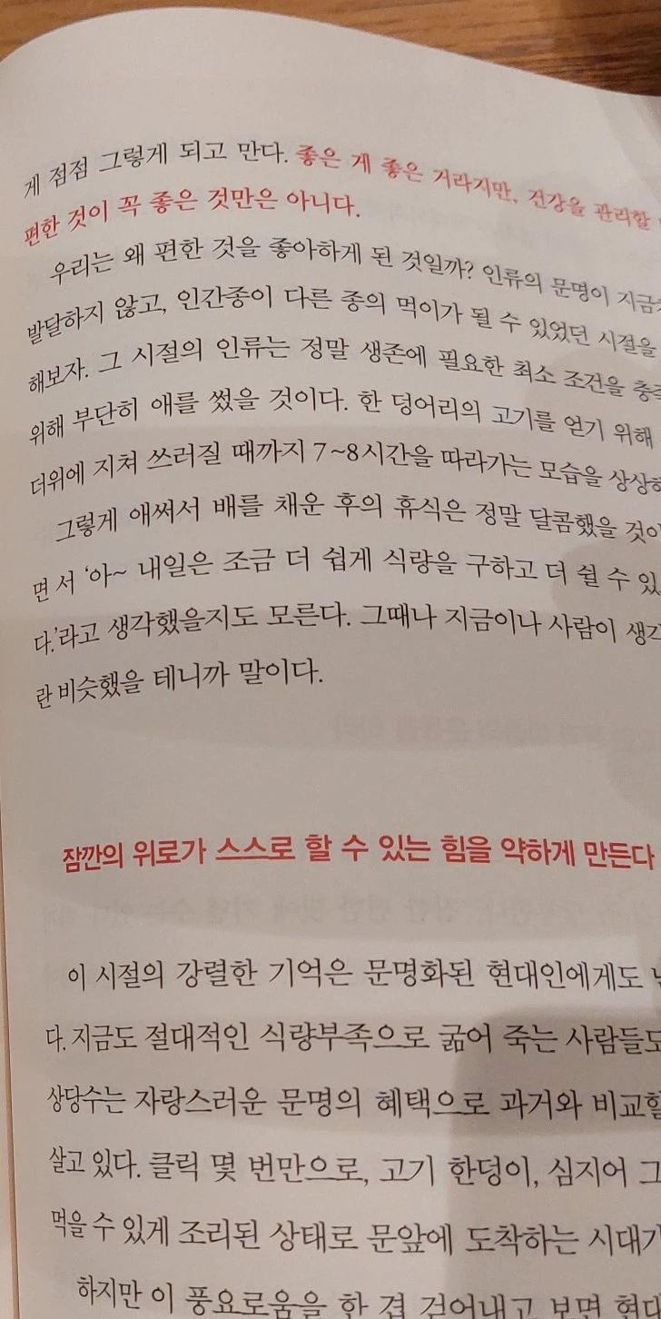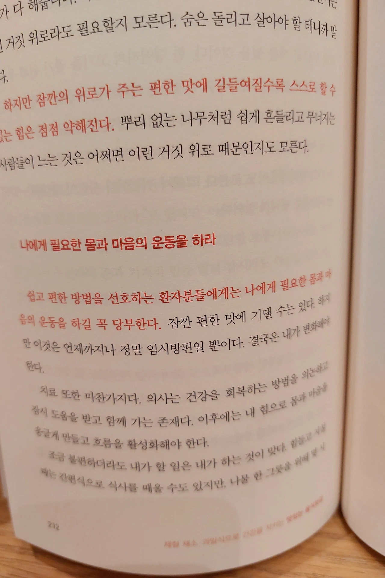 당장 입에 맛있는 설탕과 당분이 많은 케이크의 유혹, 남이 나의 근육을 풀어주는 마사지를 넘어서서 내가 나의 몸과 마음에 안정과 평화를 주는 시간을 갖는 것, 그리고 스트레스를 잘 극복하는 몸과 마음의 근력을 키우는 일에 집중하는 것, 이 책이 나에게 가르쳐 준 교훈이다