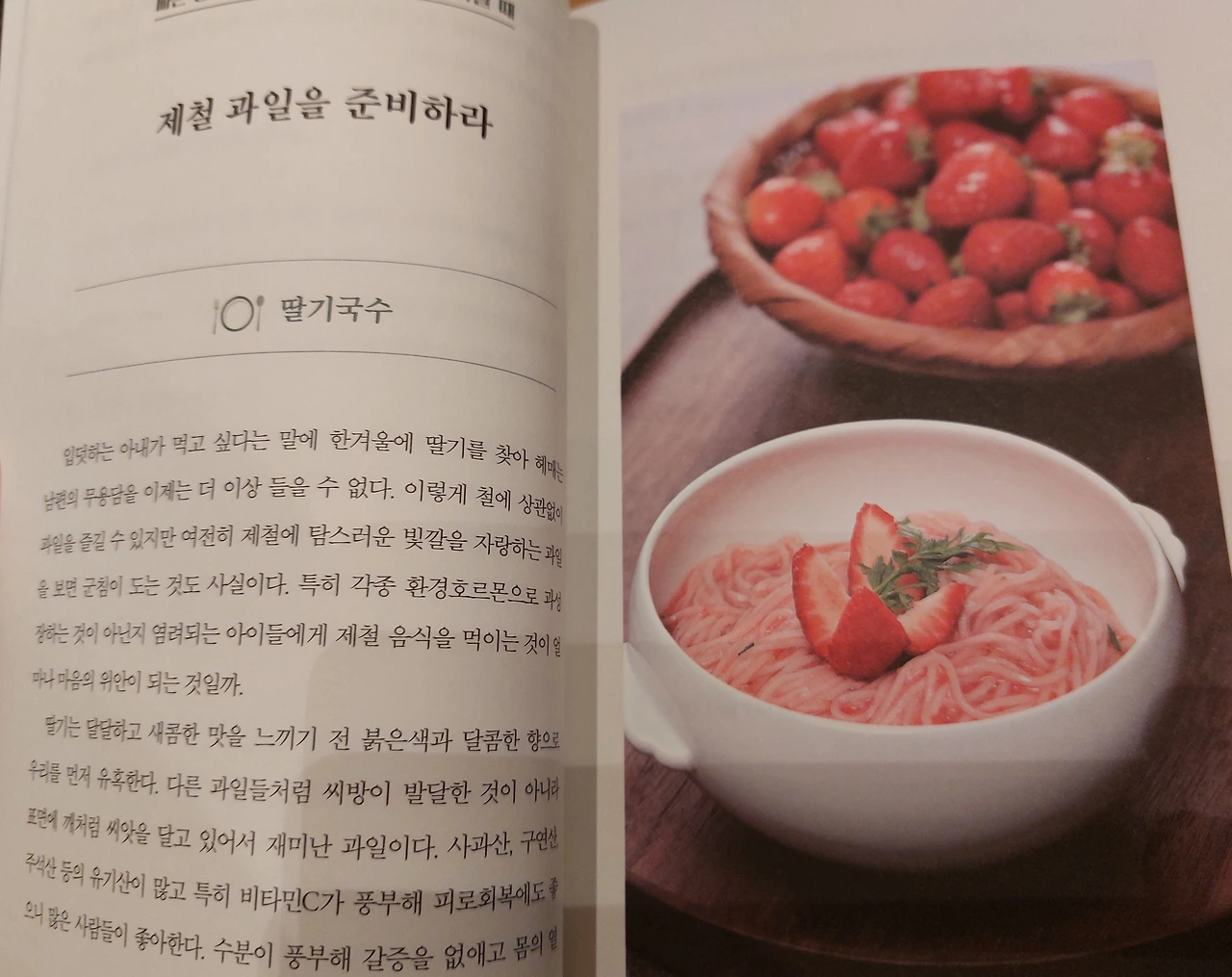 요즘 날씨가 부쩍 쌀쌀해져서 겨울 파트부터 펴보기로 한다. 어맛! 저 예쁘고 먹음직스러운 알밤들의 비주얼을 보라! 얼른 다른 사진도 넘겨본다. 이건 봄 챕터에서 찾은 딸기 국수. 와! 비주얼 곱다!
