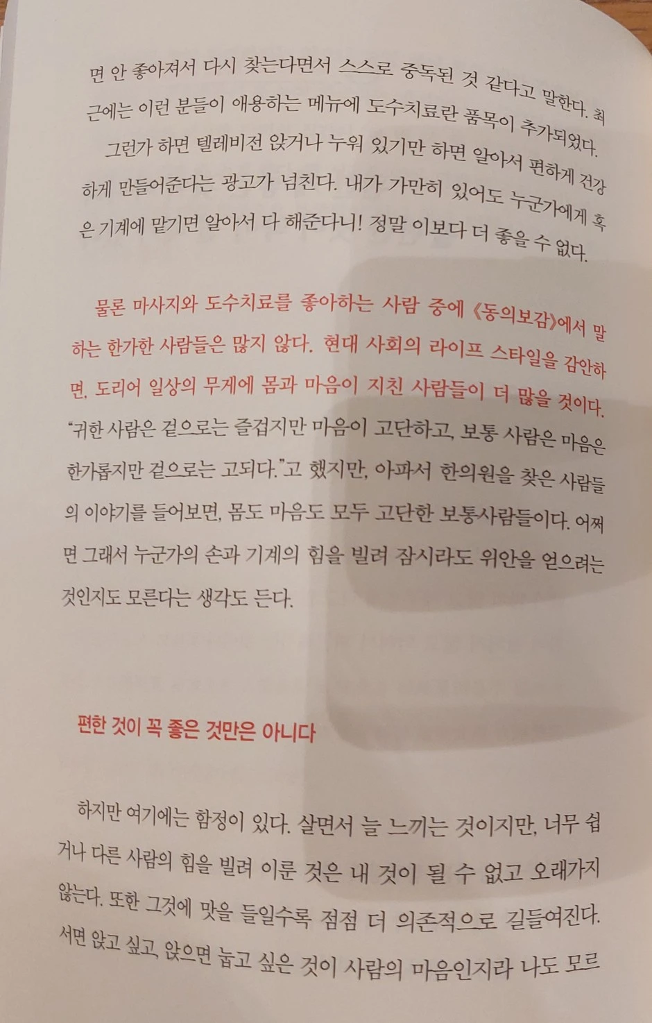 너무 쉽거나 다른 사람의 힘을 빌려 이룬 것은 내 것이 될 수 없고 오래가지 않는다는 말, 그것에 맛을 들일수록 점점 의존적이 되어 길들여진다는 그 말은 마사지 중독자 나에게 해주시는 말씀인 것 같다. 건강을 관리할 때에는 편한 것이 꼭 좋은 것만은 아닌 것을!