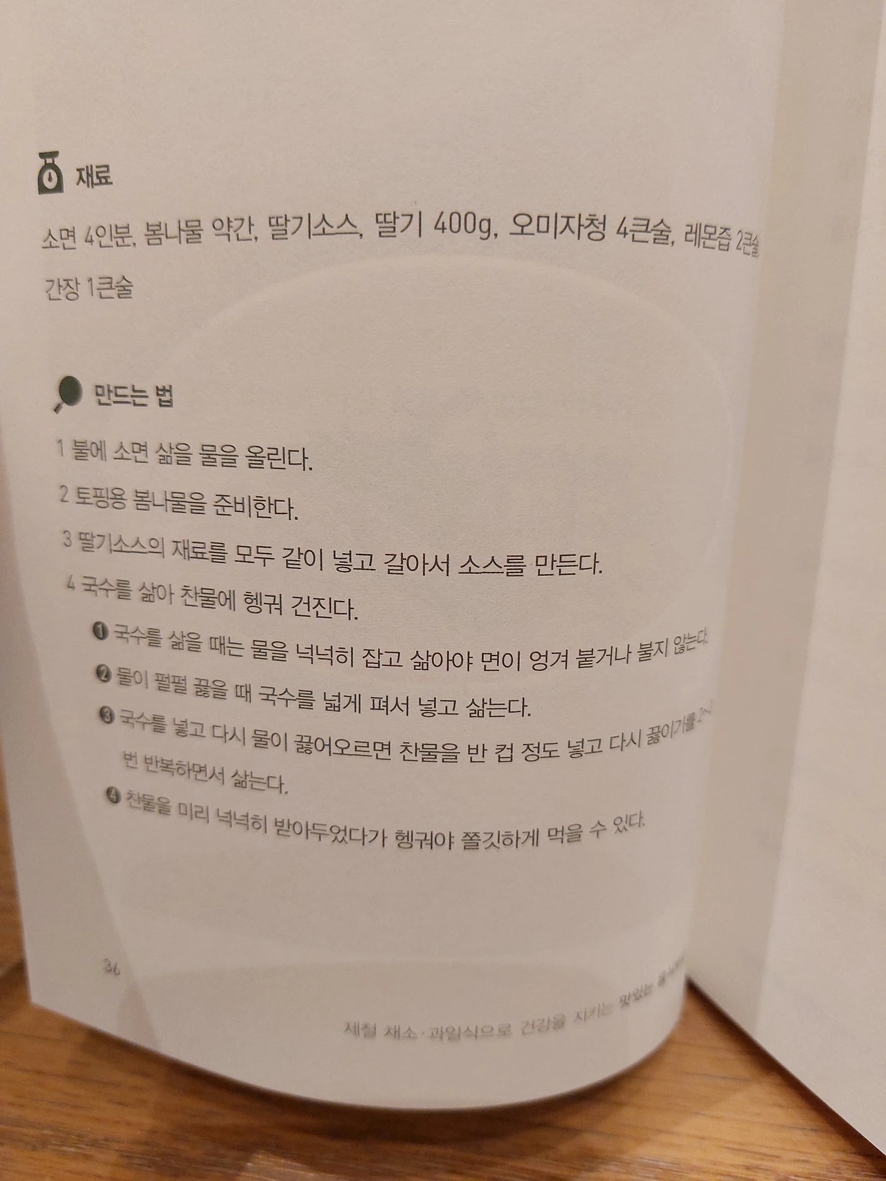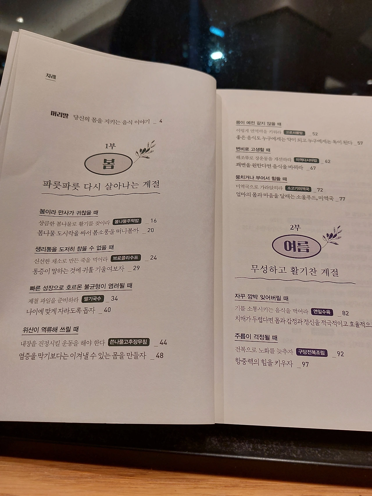 목차를 훑어본다. 아! 사계절에 나오는 제철 재료들과 관련된 건강 요리 레시피와 현대인들에게 필요한 건강이야기가 함께 나온다. 역시 건강을 지키는 데에는 가끔 먹는 약보다 매일 먹는 제철 음식인 것을!