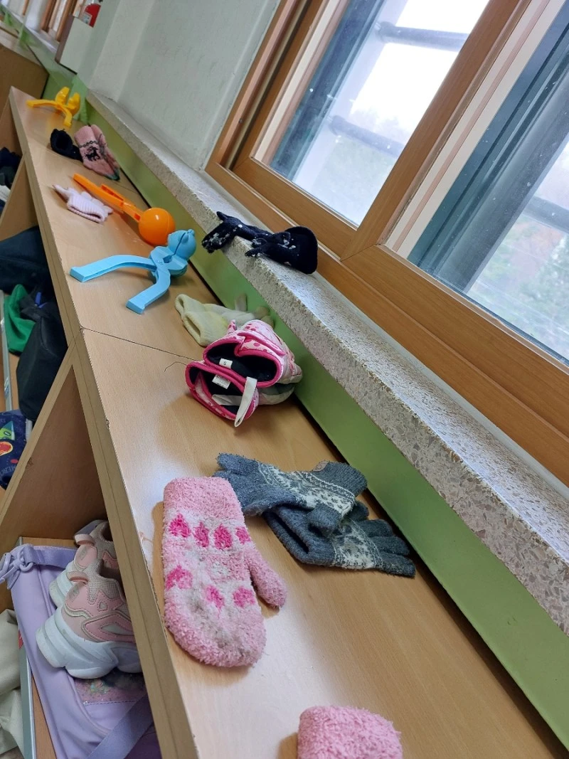 아니나 다를까, 쉬는 시간 다음 교실로 이동하려는데 복도 신발장 위에 아이들이 눈을 가지고 놀았던 전리품들이 눈에 띈다. 분명 아침에 눈 내리는 걸 보고 학부모님께 급히 알림장을 전송하셨음에 틀림없다.