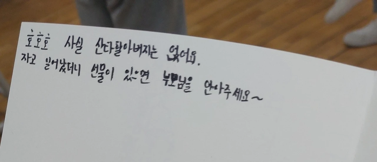 내일 아침에 머리맡에 선물이 보이면 무조건 부모님께 달려가 크게 안아 드리는 거다. 그게 너희들의 미션인 거 잘 알고 있겠지? ㅋㅋ