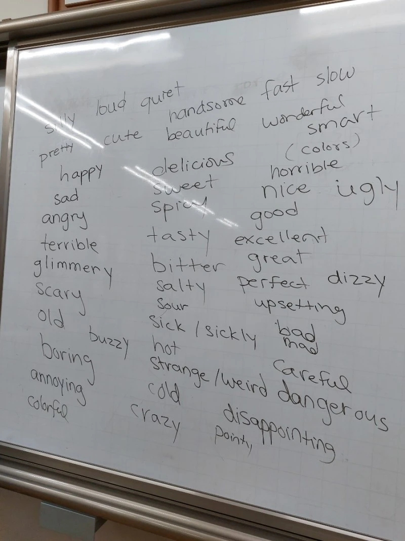 칠판 가득 다양한 꾸며 주는 말, 형용사를 배워보고 '워들'이라고 하는 낱말 게임으로 단어 공부를 한다. 자기가 아는 모든 단어를 말하고 싶은 아이들! 남들이 먼저 말한 건 중요하지 않다.