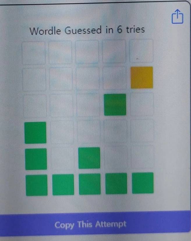 예를 들어 5글자 또는 6글자 알파벳이 있다고 할 때, 같은 위치에 있거나 다른 위치에 그 알파벳이 있으면 각각 3점, 1점, 퍼펙트하게 모든 단어를 다 맞추면 5점 획득. For the first time, let's do it randomly! 아래 화면의 노랑은 1점. 초록은 3점. 단어를 모두 맞추면 5점인 셈.