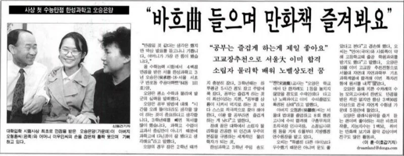 저 신문 기사 속 인터뷰 중에 나와 그녀의 공통점은 단 하나, 만화책을 좋아한다는 사실뿐이다. 아, 인터뷰 말미에. 친구가 많은 활동 파란 것도 똑같네. 학생 때는 아니었지만 지금 바흐를 좋아하는 것도 우리의 교집합이다. 어떻게 해서라도 비슷한 점을 찾고 싶은 마음이다. 20여년의 세월이 흘러 물리학 박사가 되어 유퀴즈에 나오신 오 박사님의 대답 역시 똑같다. "공부가 재밌으면 제일 좋아요!" 예의 상냥하고 예쁜 미소로 말이다.