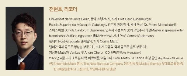 아~! 몇 년 전 이 분의 영상을 유튜브로 처음 접하며 엄청 기뻤던 기억이 난다. 2017년 브뤼헤 국제 고음악 콩쿠르 3위 입상 소식을 듣고 어찌나 자랑스럽던지! 그 후 이 분의 소리를 직접 듣게 되기를 간절히 바랐는데 그 꿈이 이렇게 빨리 이루어질 줄이야! 영상 속 인물을 눈앞에서 보니 어안이 벙벙했다.