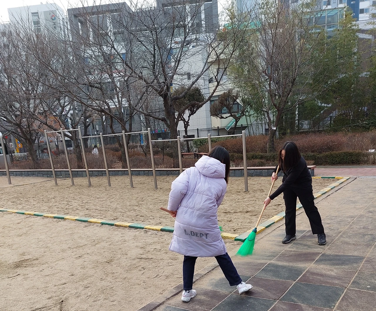 "저희도 늦게 오는 거 알아요. 근데 오늘이 초등학교 마지막 날이잖아요. 아쉬운 마음에 친구랑 놀이터 청소를 하면 어떨까 싶어 일찍 왔어요. 저희가 스스로 봉사하는 거예요!" 담임쌤이 시킨 것이 아니라고 강조하는 아이들의 얼굴에 환한 미소가 가득하다.