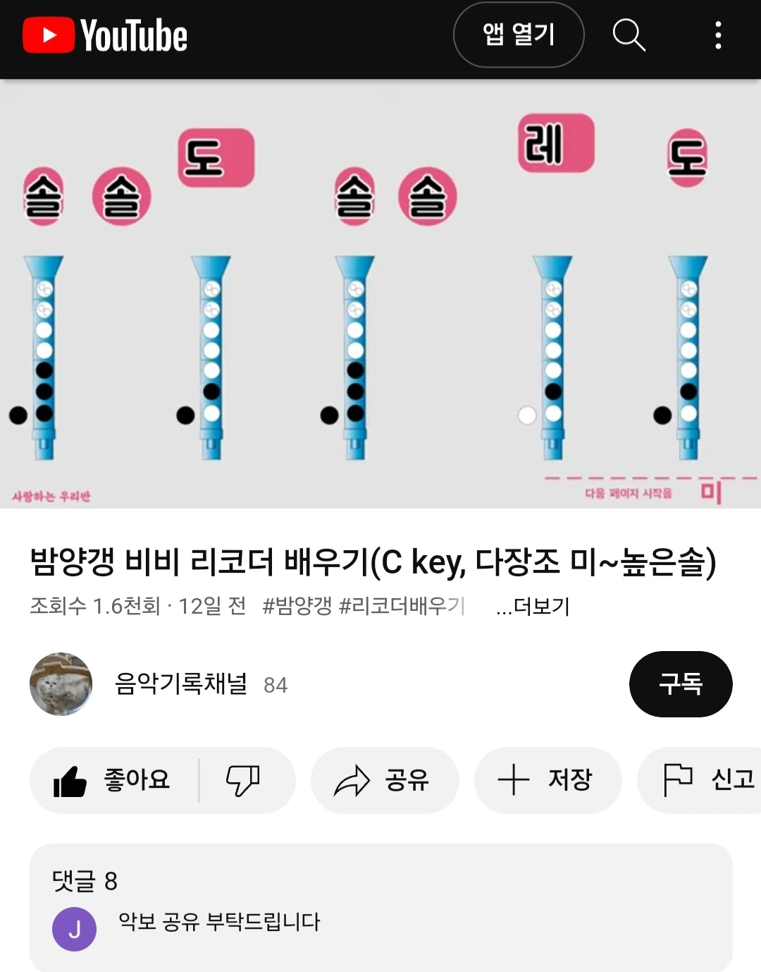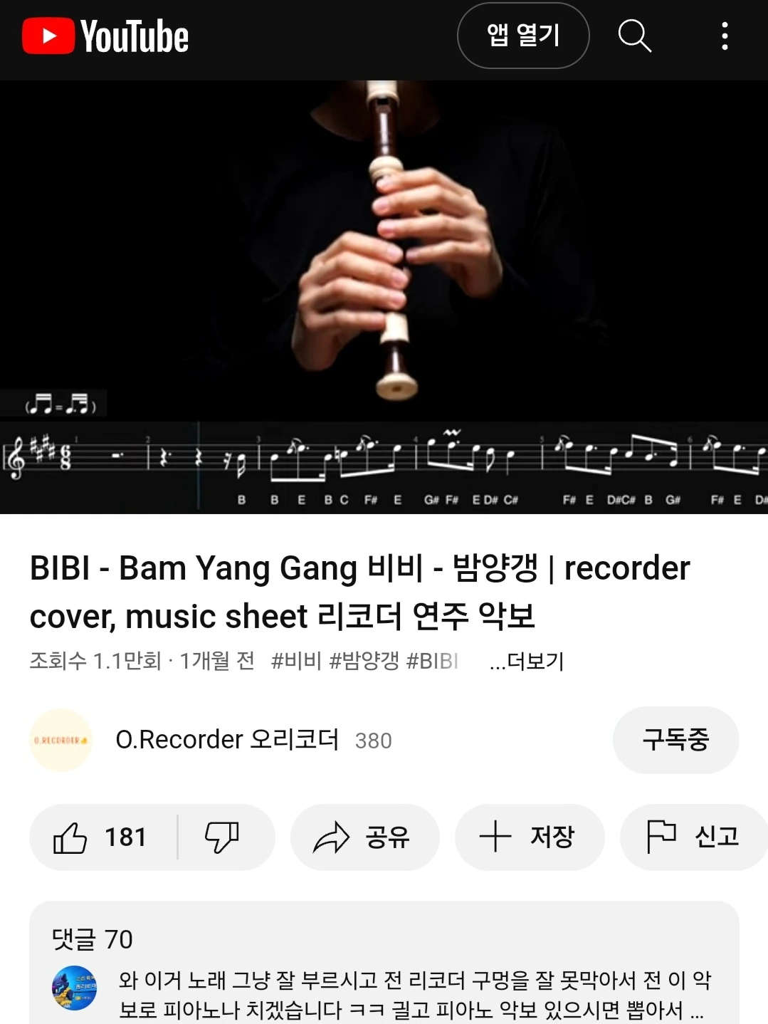 "제가 레슨 마치고 복도로 나갔는데 리코더 소리가 들리더라구요. 이상하다. 이 시간대에는 리코더 하는 분이 없는데 싶어 창문으로 보니 뒷모습만 봐도 선생님이셨어요. 그런데 무슨 곡 연습하고 계신거에요?" 교수님께 요즘 최신 유행하고 있는 가요 밤양갱 리코더 버전을 유튜브를 틀어 보여드렸다.
