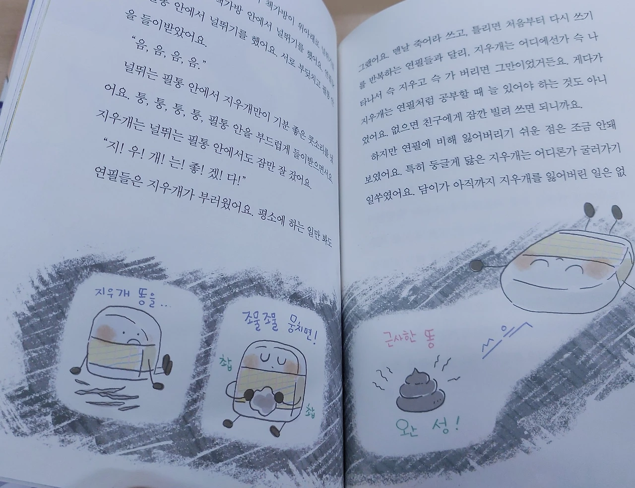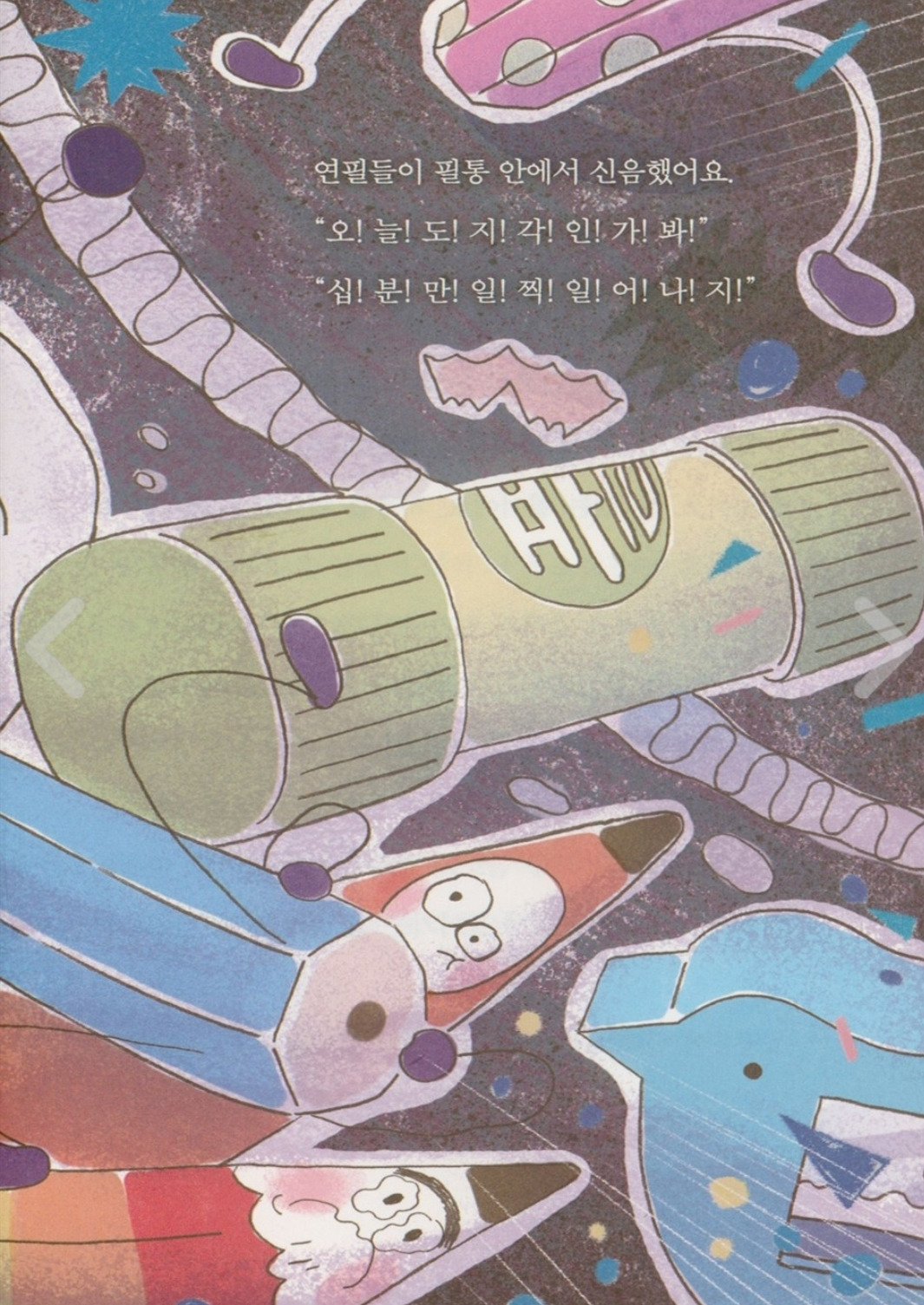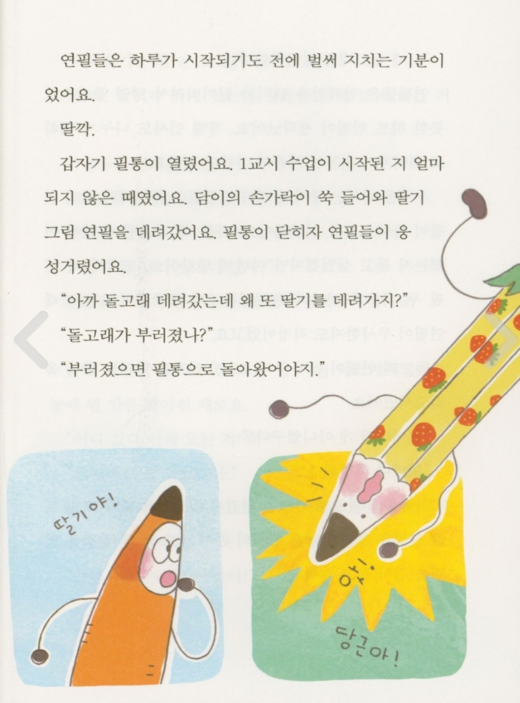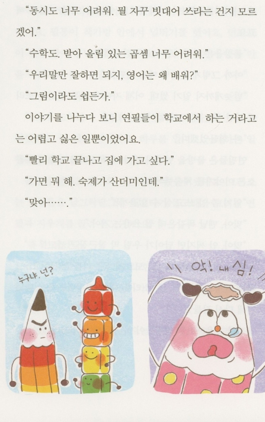 동시 쓸 땐 뭘 자꾸 빗대어 쓰라는지, 수학은 왜 이리 골치 아픈지, 우리 말도 아닌 영어는 왜 배워야 하는지 연필들의 불만은 끝이 없다. 서로를 딸기야, 당근아 부르는 연필들. 서로간에 걱정하고 위로 해주는 모습이 참 따뜻하다. 어른도 읽으며 힐링되는 동화책이랄까?