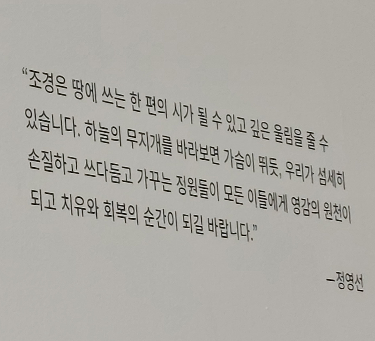 조경은 땅에 쓰는 한 편의 시가 될 수 있고 깊은 울림을 줄 수 있습니다. 우리가 섬세히 손질하고 쓰다듬고 가꾸는 정원들이 모두에게 영감의 원천이 되고 치유와 회복의 순간이 되길 바랍니다. (정영선 )