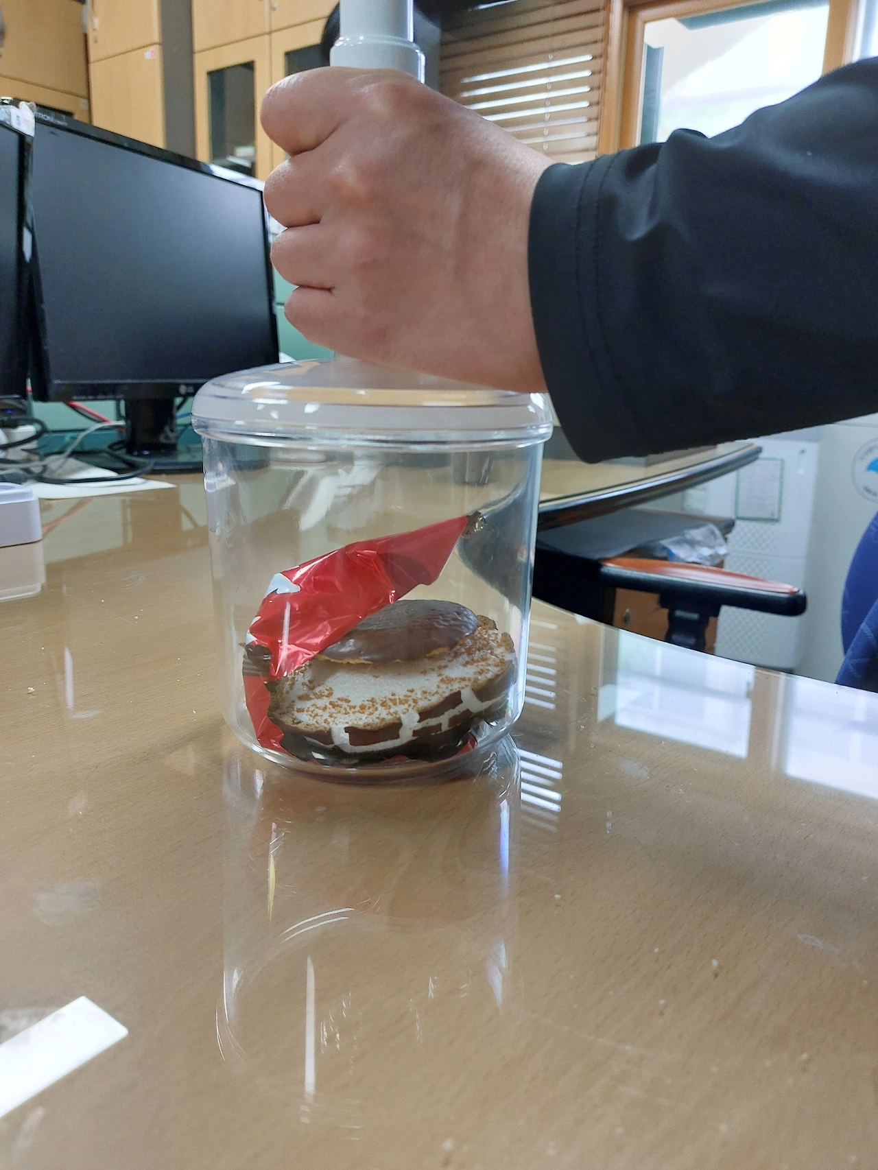 감압기로 진공상태로 만드니 마시멜로 때문에 부피가 커진 빵! 아이들이 엄청 좋아했다는 과학선생님의 설명. 이거 진짜 팔 아픈데요. 너무 신나고 즐거운 수업 시간이었겠어요. 맛난 초코 파이도 먹고 말이죠!