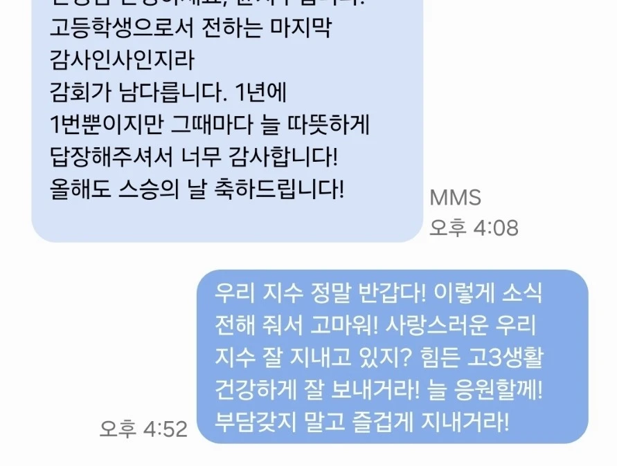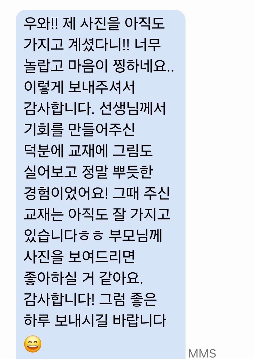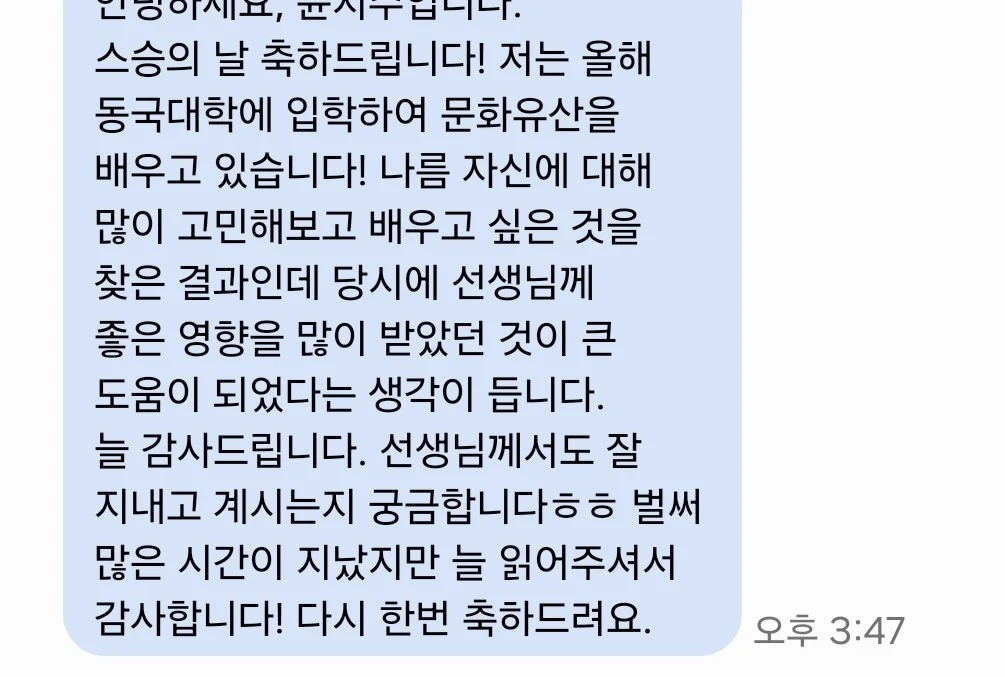 보통 6학년에 맡았던 아이들이 졸업하고도 계속 소식을 전해주는데 우리 친구는 너무 고맙게도 4학년 시절에 만난 나를 이렇게 기억해 주고 있었다. 작년은 이 아이가 고3 수험생이었다. 분주한 마음 가운데에서도 연락을 주어서 참 고마웠다. 마음속으로 이 아이가 본인의 기량을 떨지 않고 잘 발휘해 주기를 기도했는데 대학생이 되었다는 반가운 이야기를 남겨 주어 흐뭇한 마음을 감출 수 없었다.