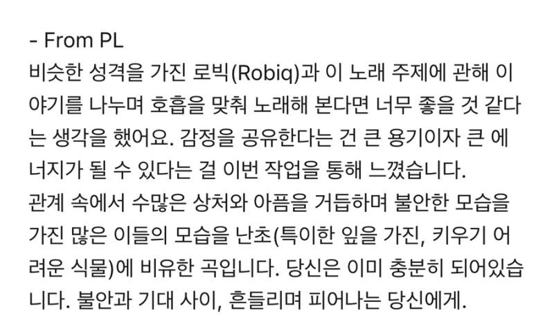 관계 속에서 저마다의 향기를 가진 화려하고 다채로운 꽃들 말고도 ‘이런 내 모습도 꽃이 될 수 있구나’라고 깨닫게 해주고 싶었어요. 불안과 기대 사이에서 상처받는 것이 두렵지만, 당신은 충분히 준비되어있는 사람입니다. 우리는 모두 사랑받을 수밖에 없는 사람들입니다. 사랑받는 것에 충족되어야 하는 자격은 없으니까요. From PL