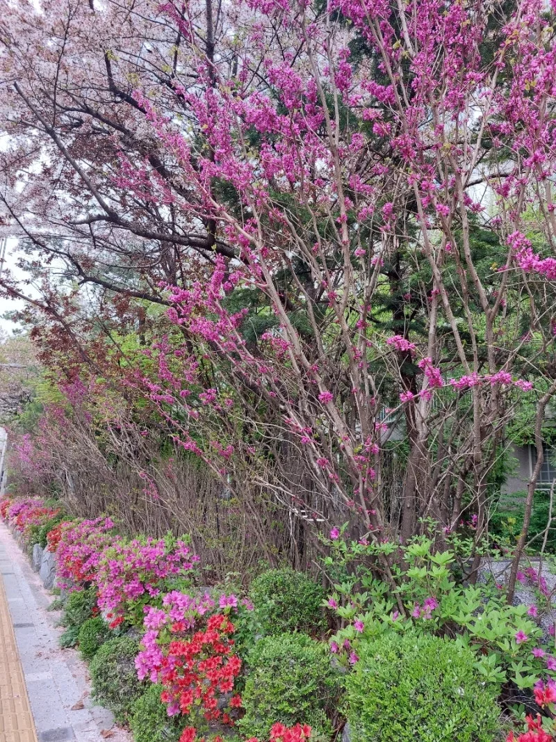 벚꽃이 필 무렵의 일이었다. 익숙한 벚꽃 근처에 이름 모를 진한 자줏빛 꽃이 탐스럽게 핀 광경을 보았다. 마치 철쭉과도 비슷한 색이었다.