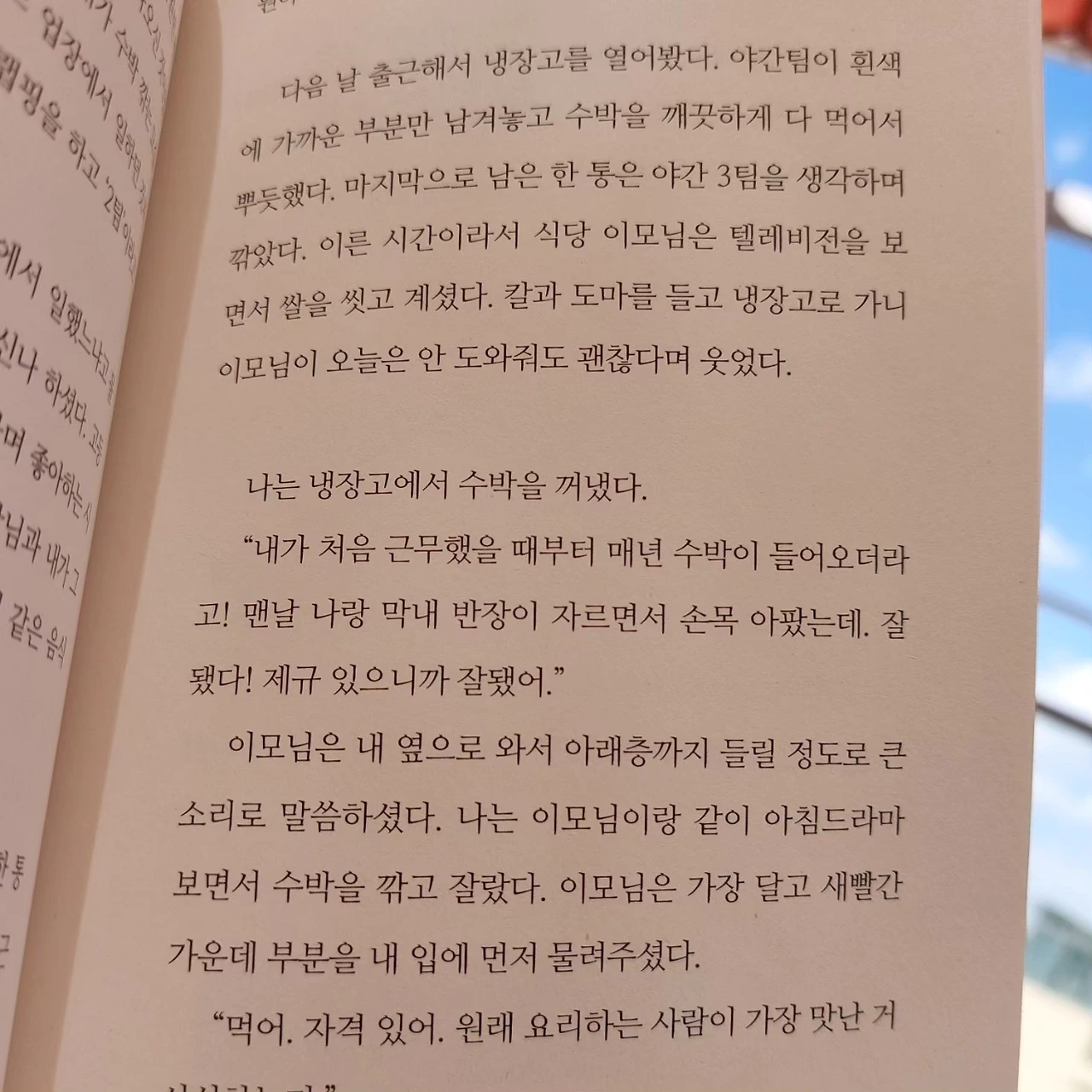 나는 이모님이랑 같이 아침 드라마를 보며 수박을 깎고 또 잘랐다. 이모님은 가장 달고 새빨간 가운데 부분을 내 입에 먼저 물려주셨다."먹어, 자격 있어. 원래 요리하는 사람이 가장 맛난 거 시식하는 겨."