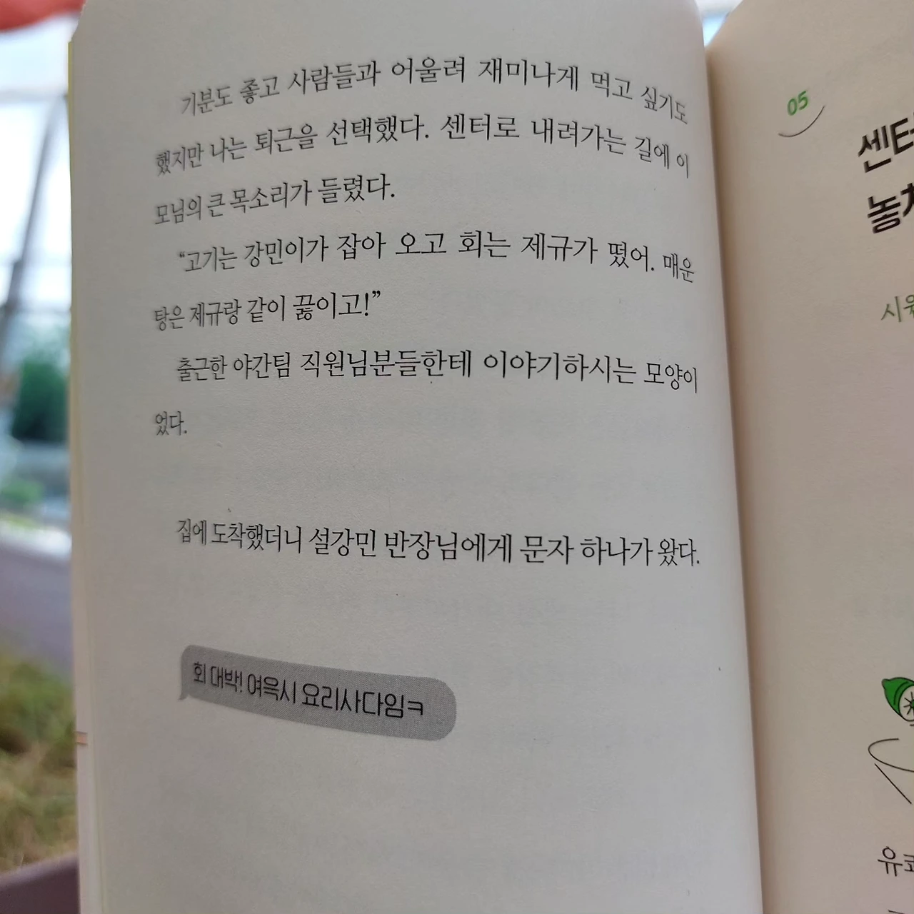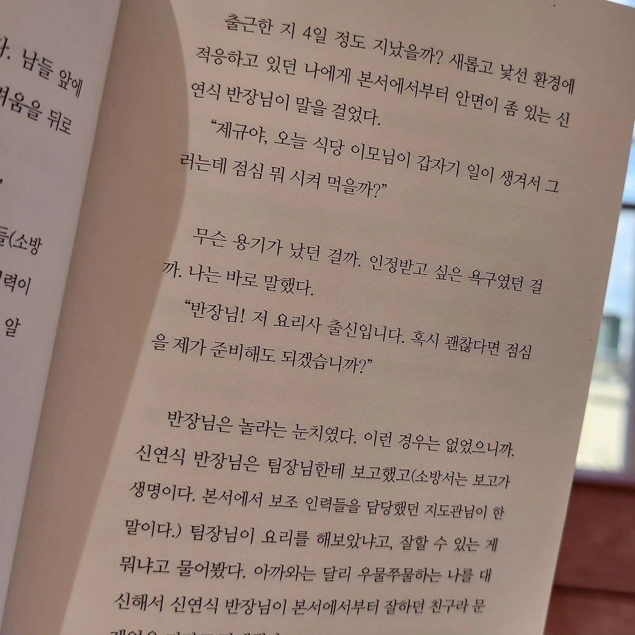 술술 읽히는데 푹하고 묵직하게 가슴을 치고 들어오는 부분이 많은 책. 그중 내가 제일 좋아했던 부분은 바로 여기다. 119 안전 센터의 실세, 식당 이모님의 말씀이다. 이렇게 사랑스러운 식당 풍경이라니!