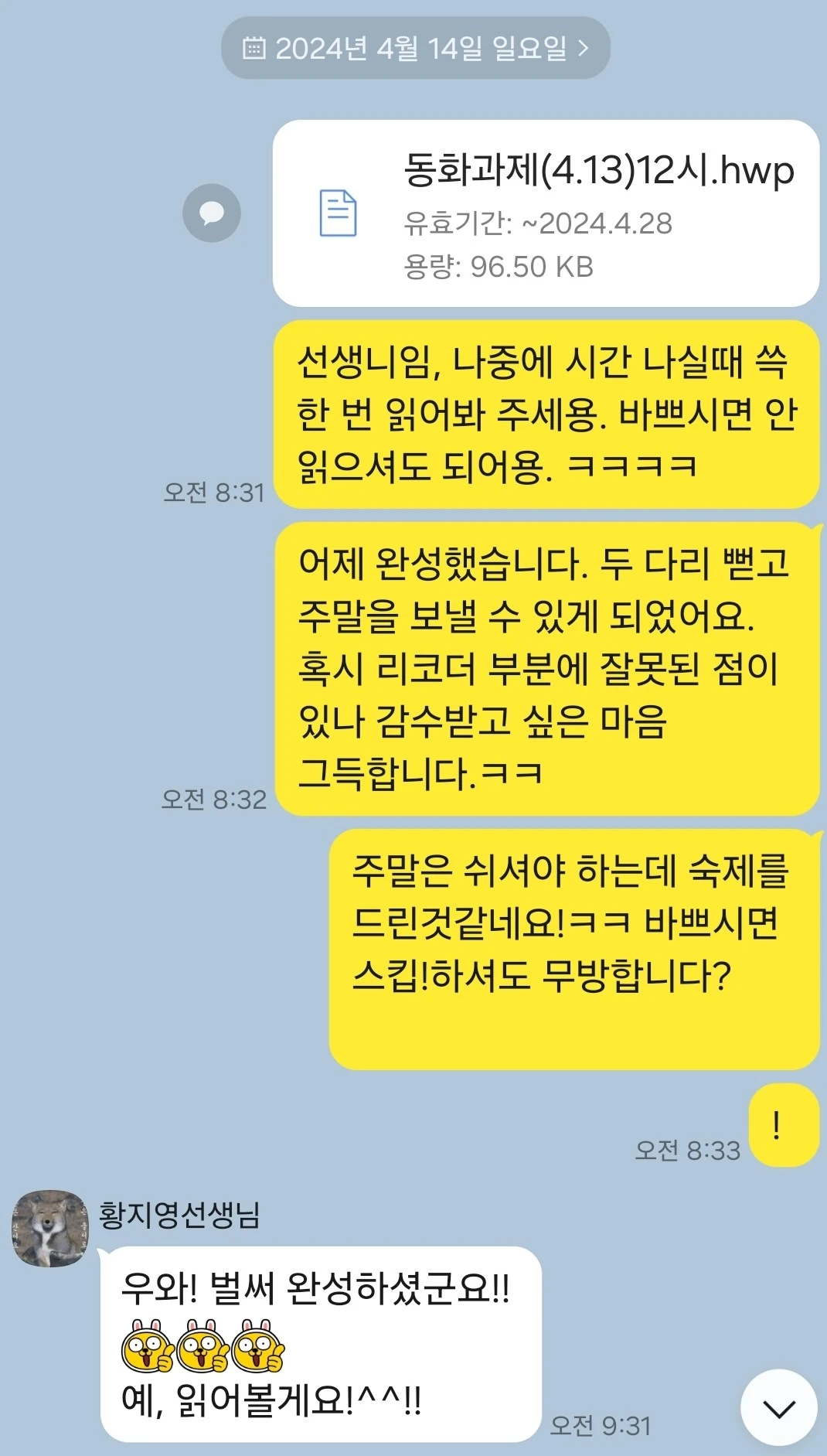 동화 수업을 들을 때 힘겨운 지점은 비단 창작의 영역 뿐이 아니다. 서로 모여 이야기를 나누는 합평 시간도 고난이다. 이론은 나도 잘 안다. 이 시간에 나오는 의견들이 피가 되고 살이 된다는걸. 애정 어린 충고와 지적이 나의 작품을 더 살찌운다는걸. 그래도 감정적으로 유쾌하진 않다. '피할 수만 있다면 이 잔을 거두어 주십시오.' 외치고 싶다.