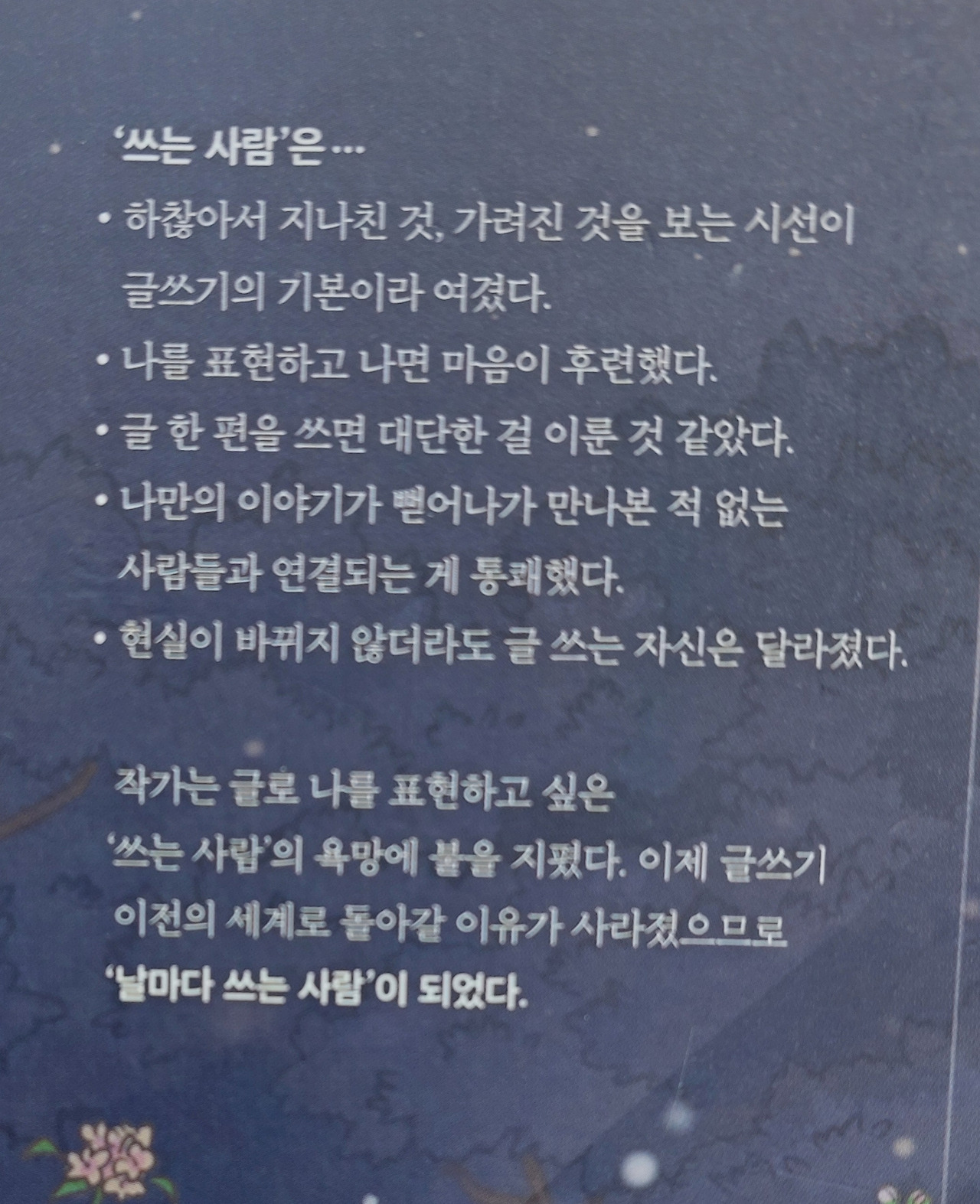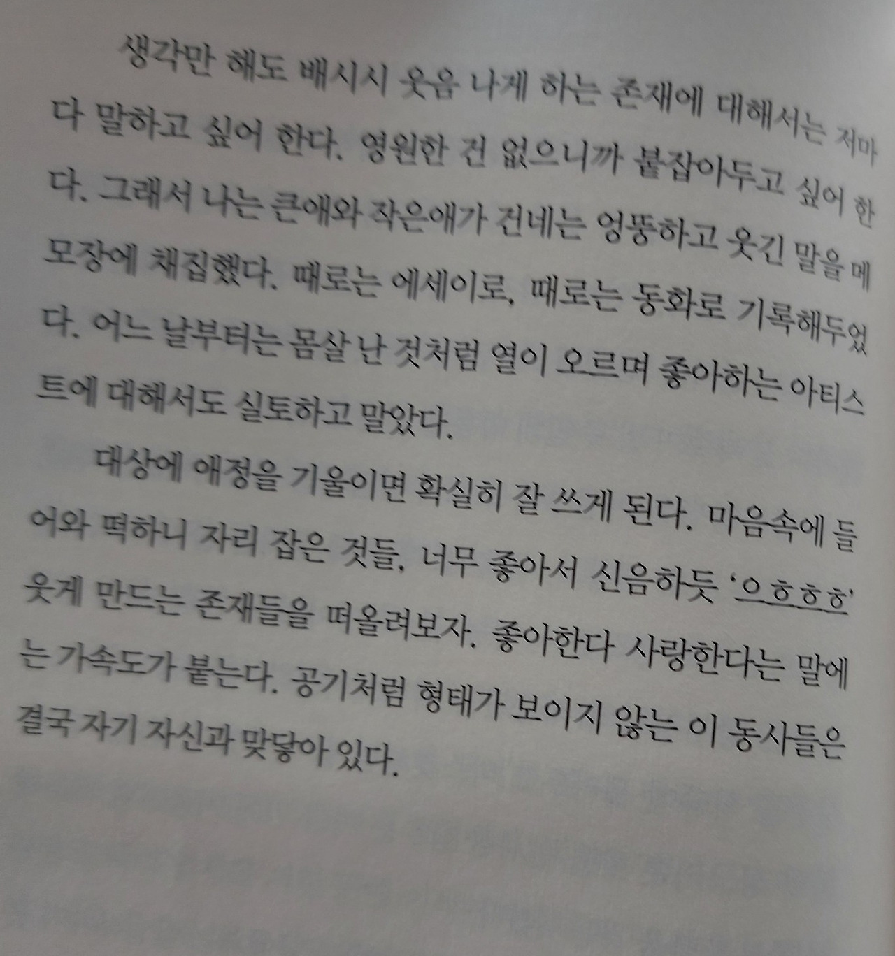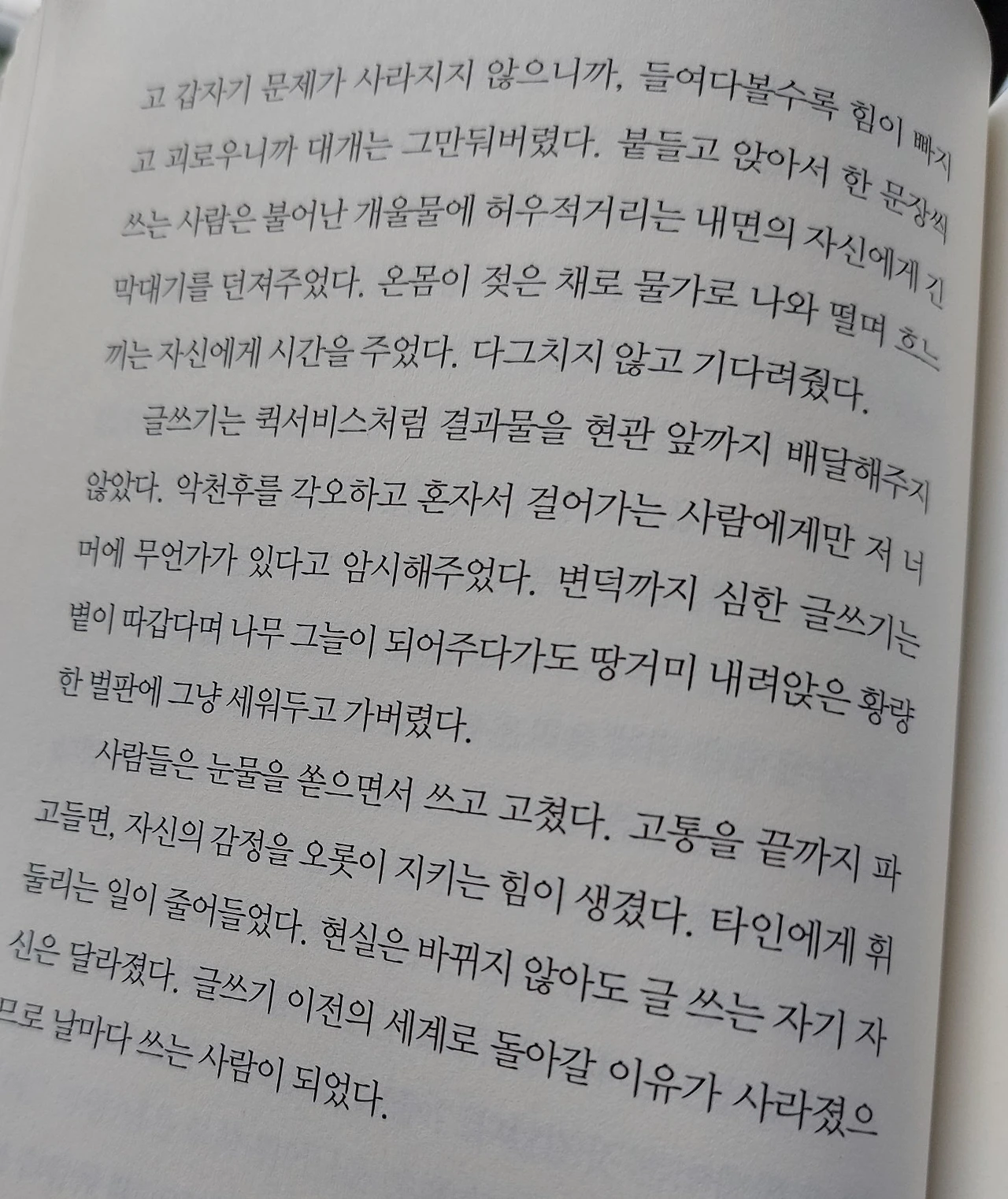 고통을 끝까지 파고 들면, 자신의 감정을 오롯이 지키는 힘이 생겼다. 타인에게 휘둘리는 일이 줄어줄었다. 현실은 바뀌지 않아도 글 쓰는 자기 자신은 달라졌다. 글쓰기 이전의 세계로 돌아갈 이유가 사라졌으로 날마다 쓰는 사람이 되었다. p.90