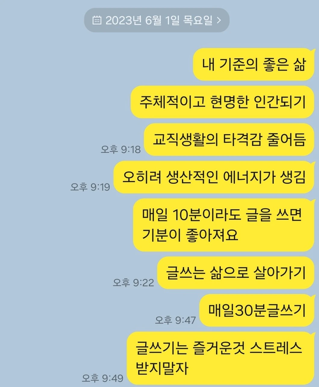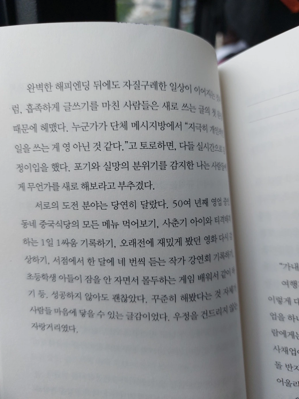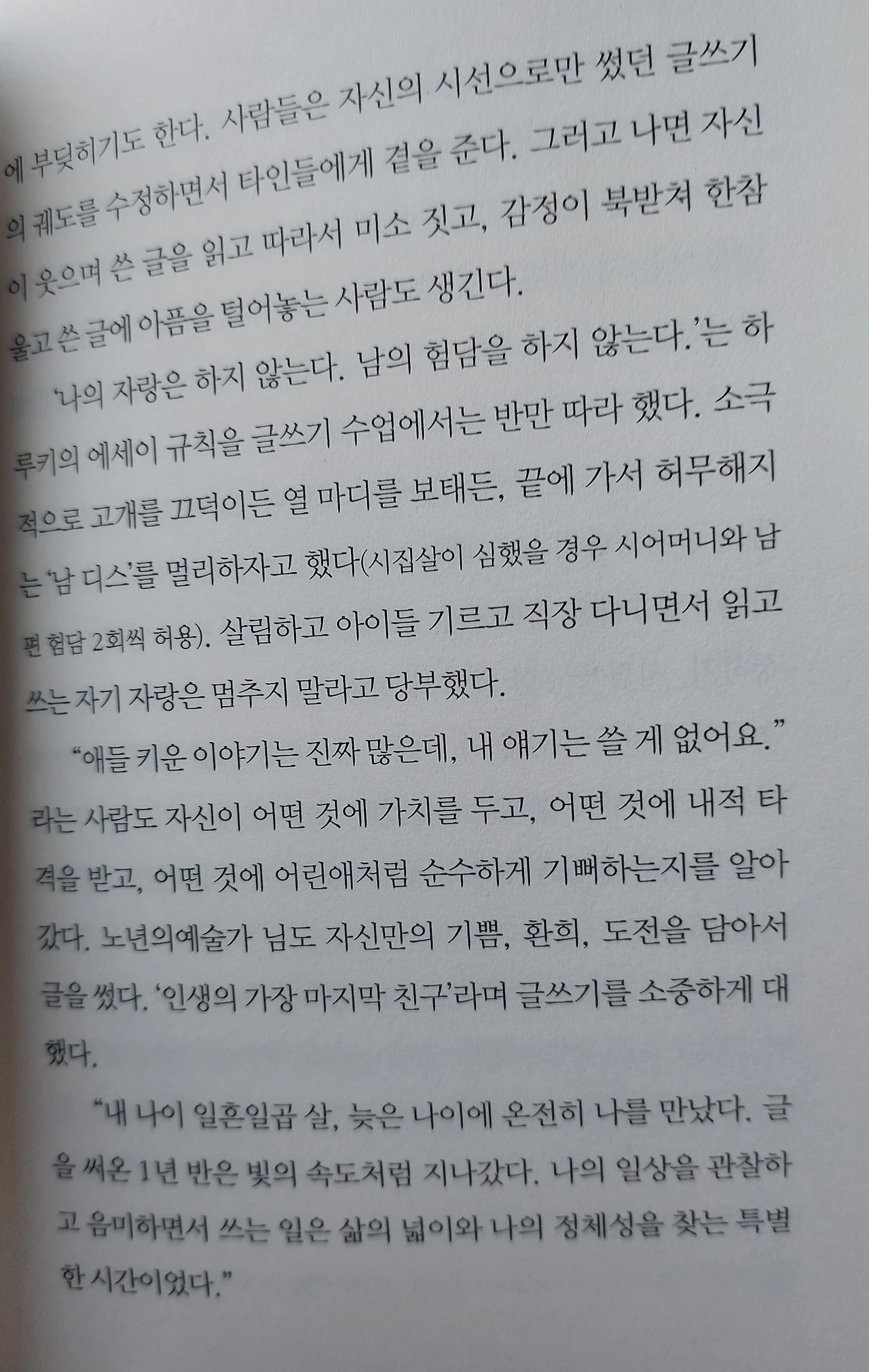 고통을 끝까지 파고 들면, 자신의 감정을 오롯이 지키는 힘이 생겼다. 타인에게 휘둘리는 일이 줄어줄었다. 현실은 바뀌지 않아도 글 쓰는 자기 자신은 달라졌다. 글쓰기 이전의 세계로 돌아갈 이유가 사라졌으로 날마다 쓰는 사람이 되었다. p.90