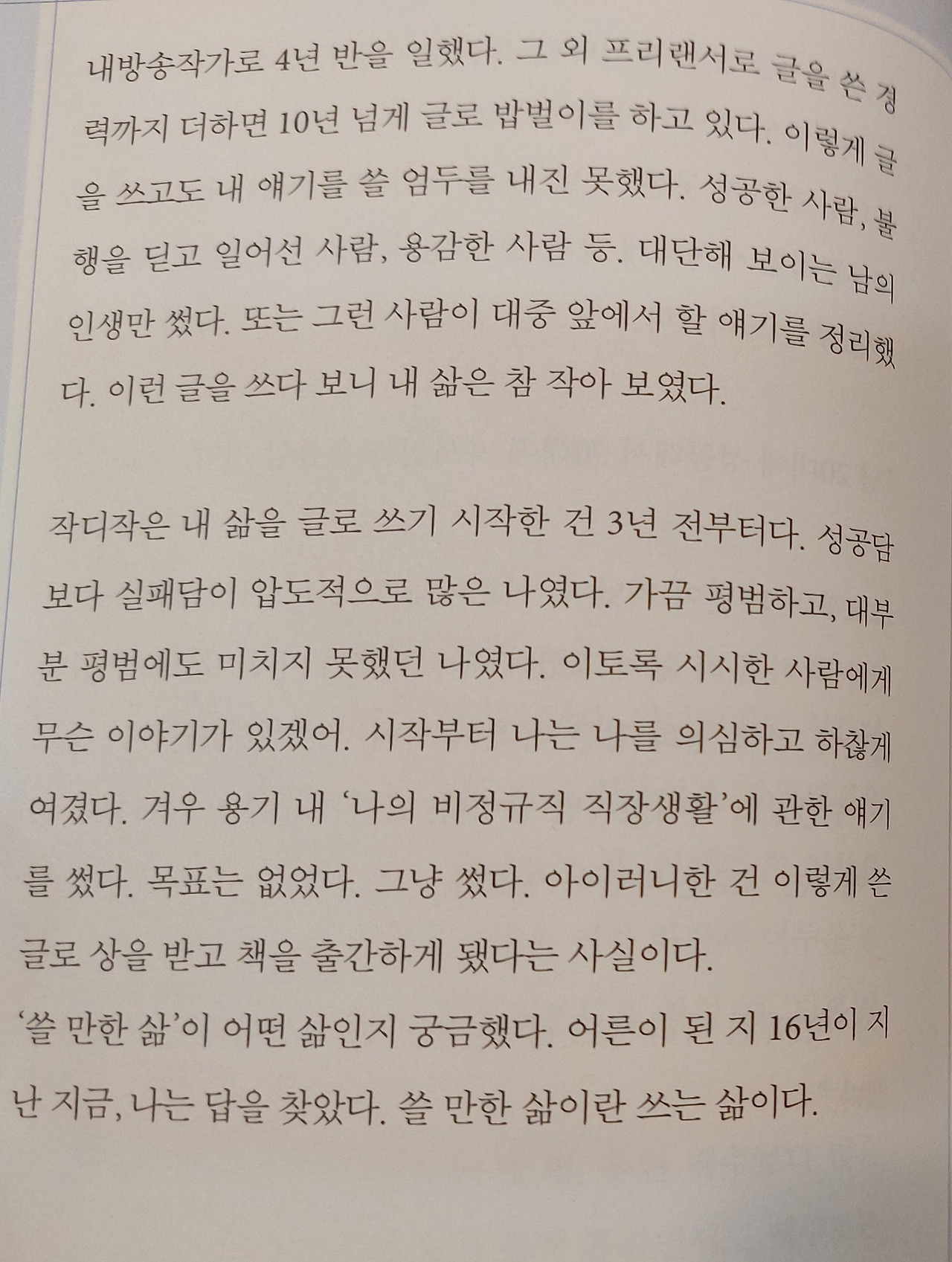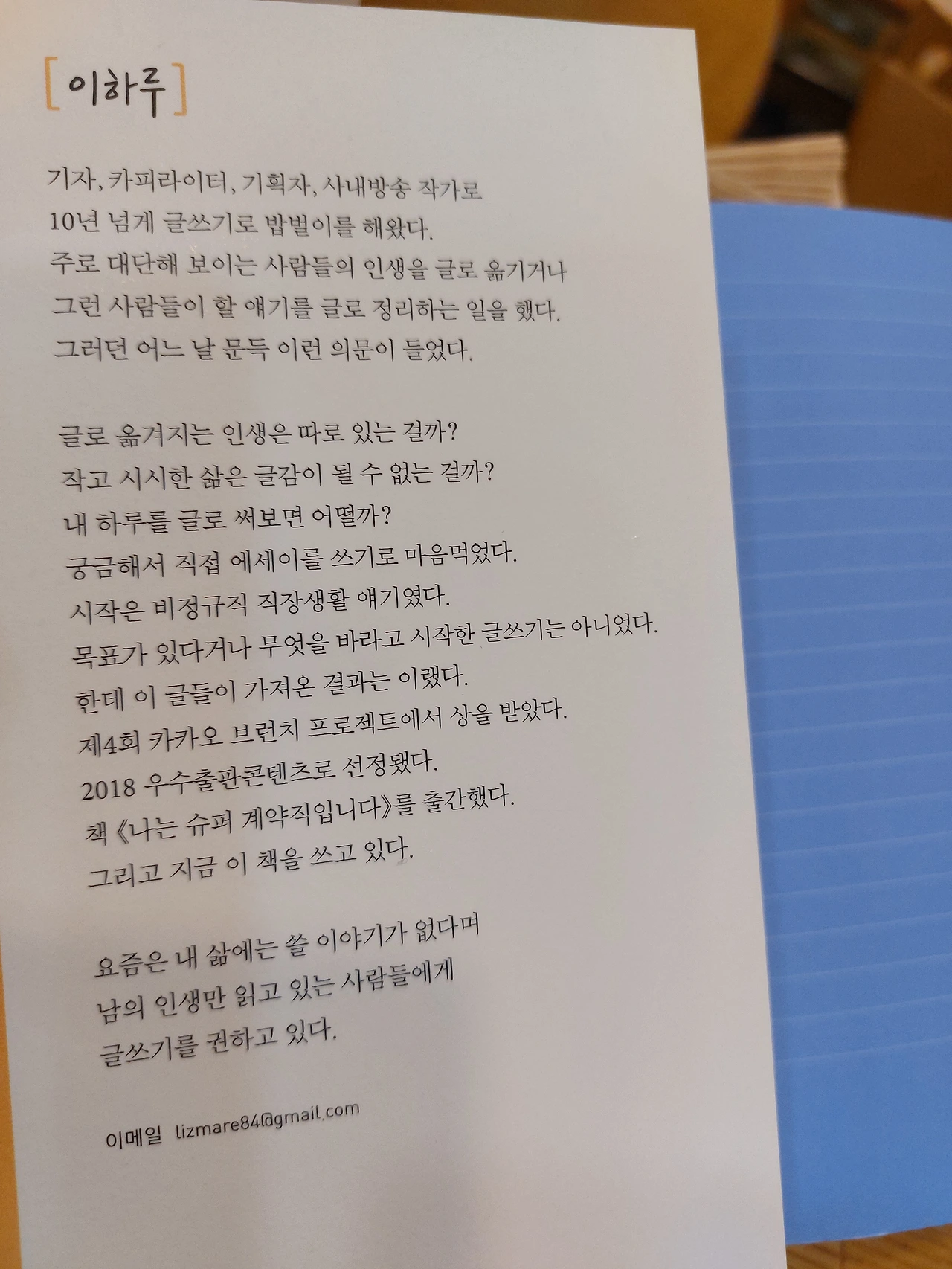 기자, 카피라이터, 사내 방송작가를 거쳐 카카오 브런치 프로젝트의 선택을 받으신 이 분. 작가님 성함과 책의 제목이 찰떡임. 센스 있는 선택이었다.