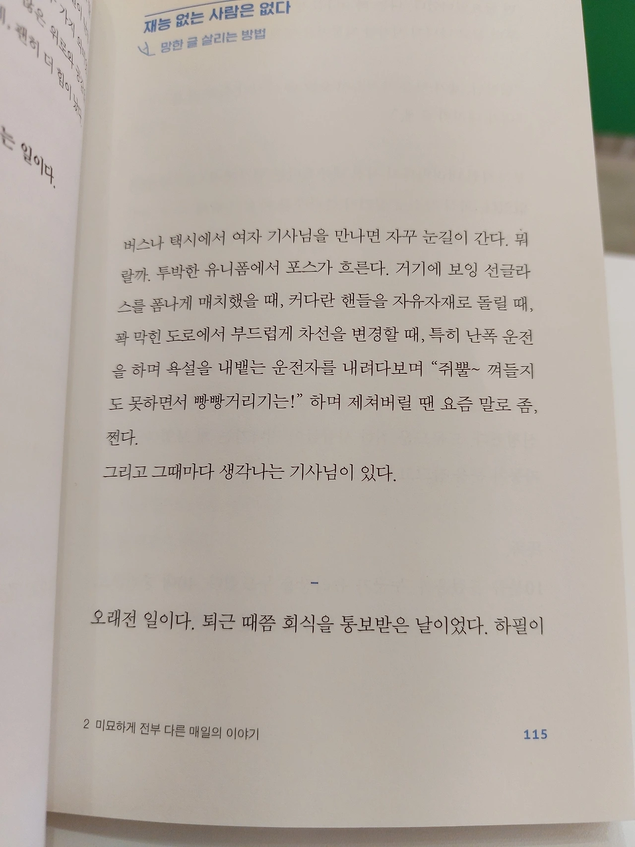 일상에서 뭉클한 이야기를 발견하는 작가님의 놀라운 능력. 그건 애정 어린 눈이었고, 따뜻한 가슴이었고, 투명하고 순수한 마음이었다. 여자 대리운전기사님을 만난 사연 속에서 난 그걸 읽었다. 남다른 관찰력 그리고 그걸 기록한 부지런한 손, 순간의 스치는 찰나를 붙들고 한 편의 글로 묶어내는 능력 말이다. 순발력과 지구력이 다 필요한 일이다. 결국 정신력도 체력일지 언데 와!
