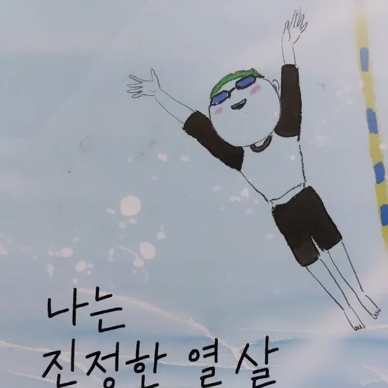 주인공이 입고 있는 복장과 노랑, 파랑 레인을 보고서야 빙그레 미소 지었다. 마침 물안경을 쓴 이 아이도 웃고 있네. 수영을 하는 아이의 손끝이 부드럽게 힘이 빠진 채 펼쳐져있다. 물속에서 마치 스카이다이빙을 하는 느낌이 든다. 네가 이번에 나올 사랑스러운 주인공이구나.