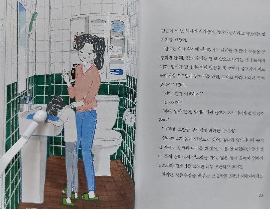 물속에 둥둥 떠있는 아이의 표정이 편안하고도 자유롭다. 이런 우리 친구도 처음부터 수영이 편안했던 건 아니었다. 생존수영 수업을 앞두고 우리 친구는 고민이 한가득이다. 화장실 세면대에 코를 박고 숨 참기 연습을 하고 거실에서 발레리나처럼 부드럽게 발을 차는 연습을 한다.