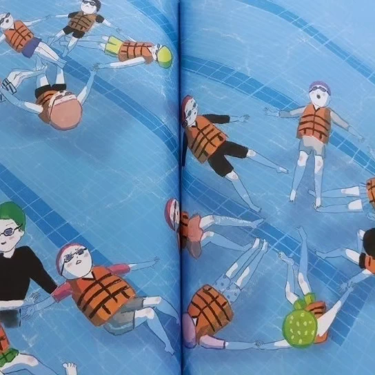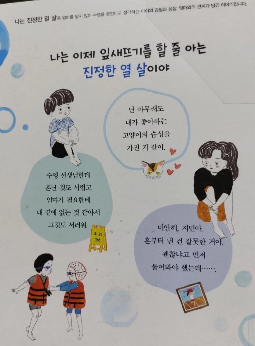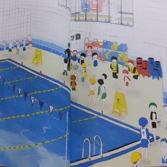 어렸을 때부터 수영레슨을 받은 아이들이 아니라면 누구나 무섭고 겁이 날 것 같다. 물 먹으면 어쩌지, 물에 빠지면 어떡하지 싶고 말이다. 아이고 예뻐라. 알록달록 수영모자를 쓴 꼬마친구들의 모습이 어찌나 귀엽고 사랑스러운지! 읽으면서 킥킥대고 웃다가 뭉클해서 눈물이 고이다가 감동 먹어서 사진 찍고 다 읽고 나서 딴 사람들에게 막 추천하는 동화책이다.