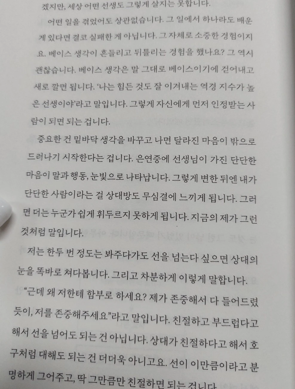 [p.11] 교사는 학부모와 아이를 위해서라면 언제든 마음을 열고 이야기를 나눌 수 있어야 하지만, 상담의 선을 넘어서는 대화에서는 언제든지 단호하게 말할 수 있어야 합니다.