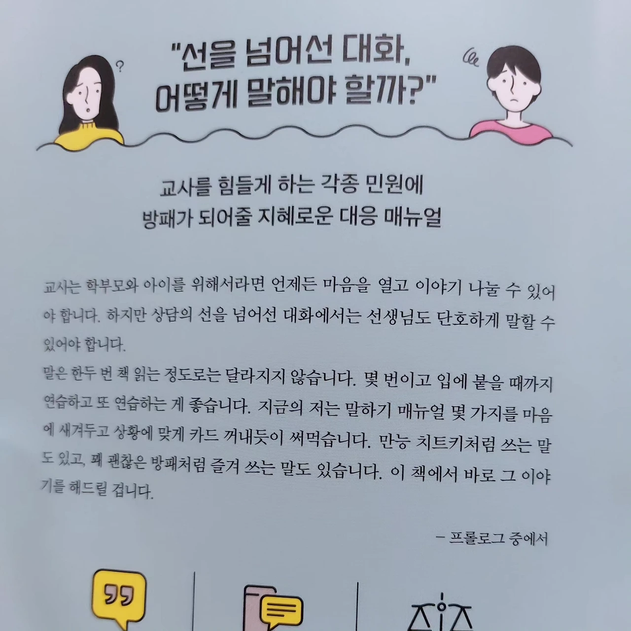 '당당하게 학부모와 마주하게 위한 민원대응법'이라는 부제가 진짜 매력적이다. 교직 생활을 수행하며 피가 되고 살이 될 말하기 매뉴얼이 출판되어 참 반갑다. 모든 교실에 한 권씩 구비하고 틈날 때마다 읽고 또 읽어야 할 책이라는 생각이 든다.