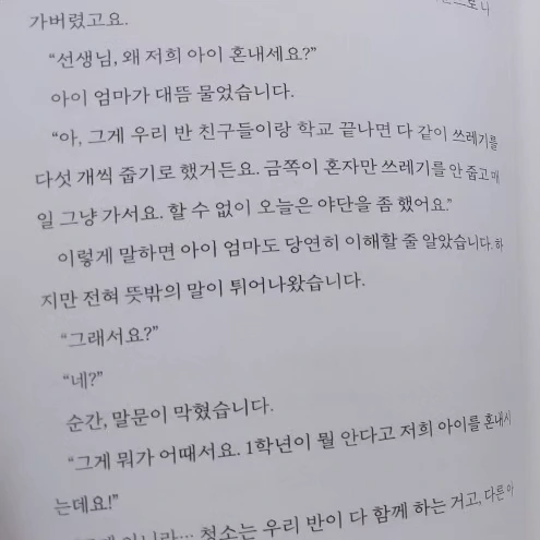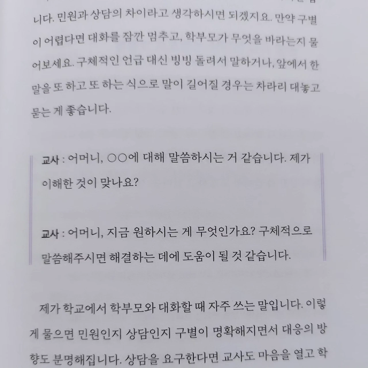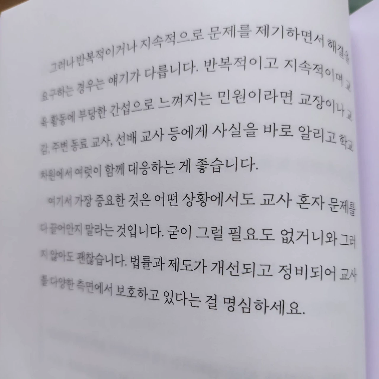 이 책에는 저자가 직접 경험한 일, 많은 선생님들을 인터뷰하고 상담하며 마주한 수많은 사례가 이 책 안에 녹여져 있다. 이럴 때는 이렇게, 저럴 때는 저렇게 식으로 단순하게 해결되지 않는 것이 민원을 제기한 학부모와의 대화다. 쉬울 수가 없다. 선생님은 선생님대로, 학부모님은 학부모님대로 서로의 입장 차이가 존재하고 모두 상대방에게 서운한 입장이다.