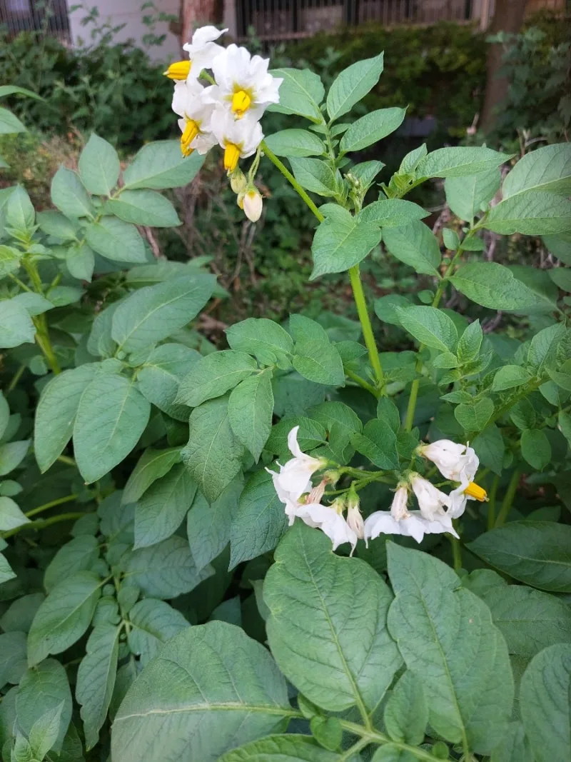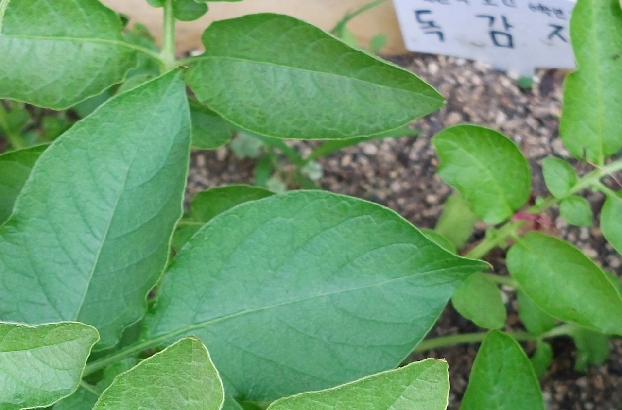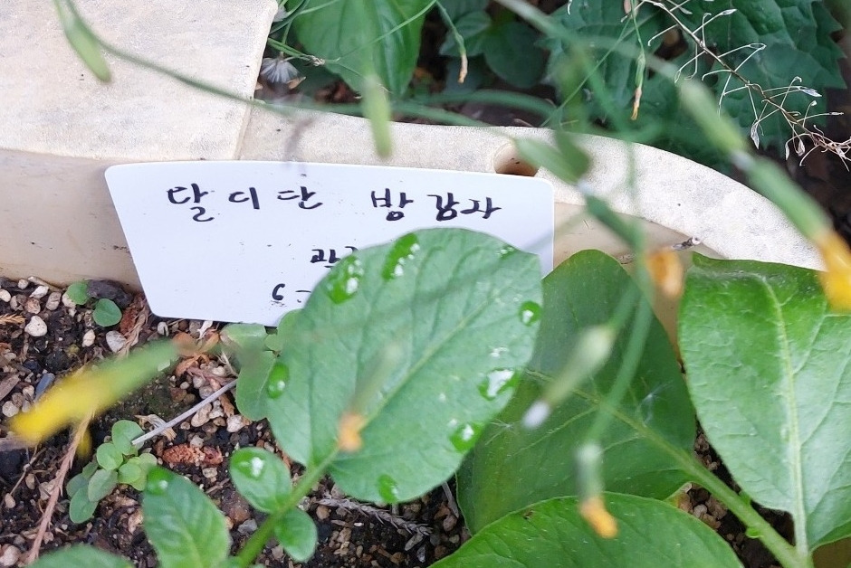 몇 주 전, 학교 화단을 지나가다가 감자꽃이 핀 광경을 마주하였다. 소박한 하얀 감자꽃 옆으로 봄철에 6학년 아이들이 만든 이름표가 보인다.