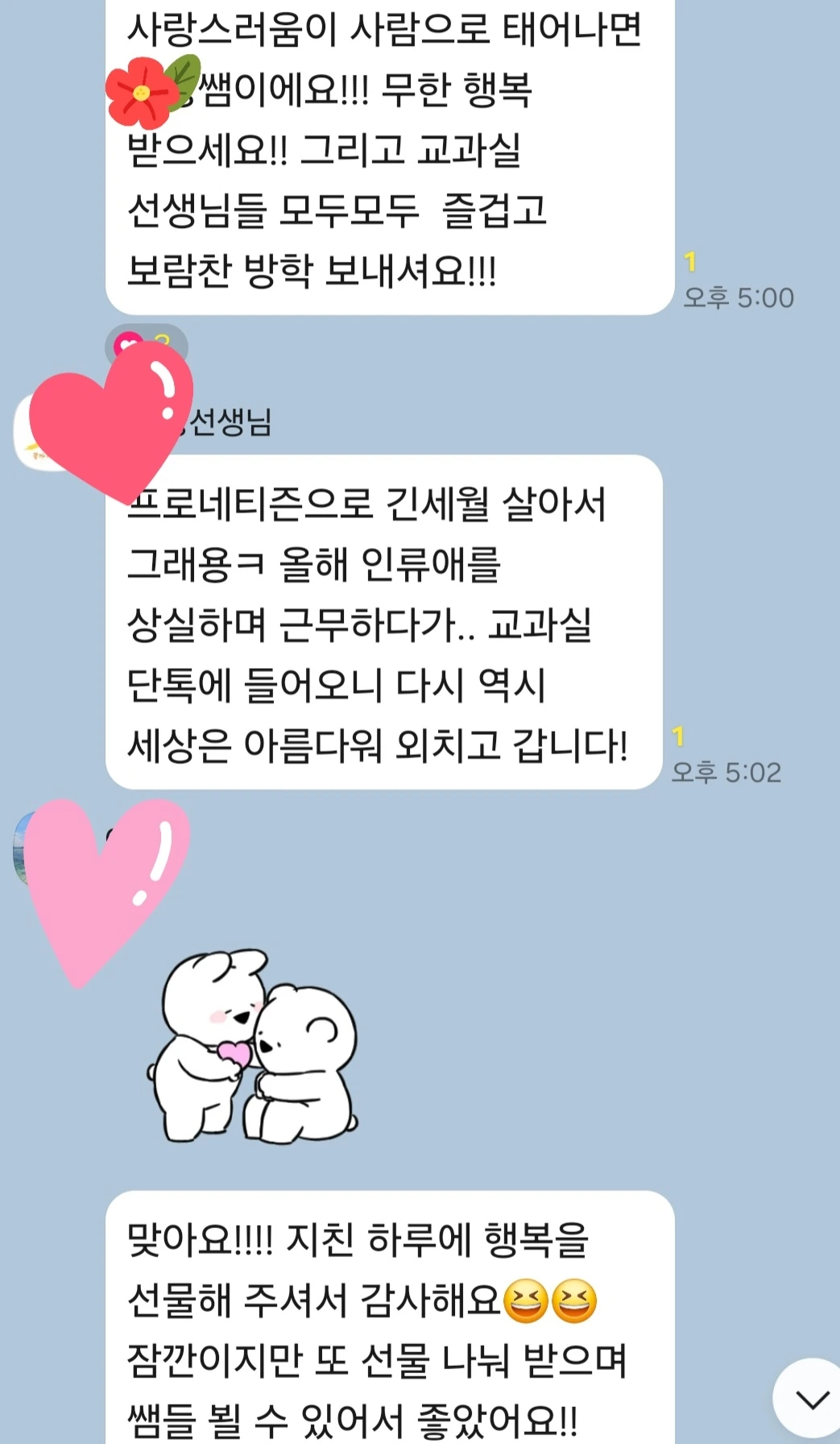 진짜 신기한 인연인 게 쌤이 전근 간 학교가 우리 원어민쌤 베프가 근무하는 학교다. 그래서 더 어제 두 분의 원어민 선생님들끼리 전화하며 우리 쌤의 이야기를 했다고 한다. 아니, 이렇게 한국사람 미국사람 가릴 것 없이 모두에게 사랑을 받을 수가 있는 것인가!