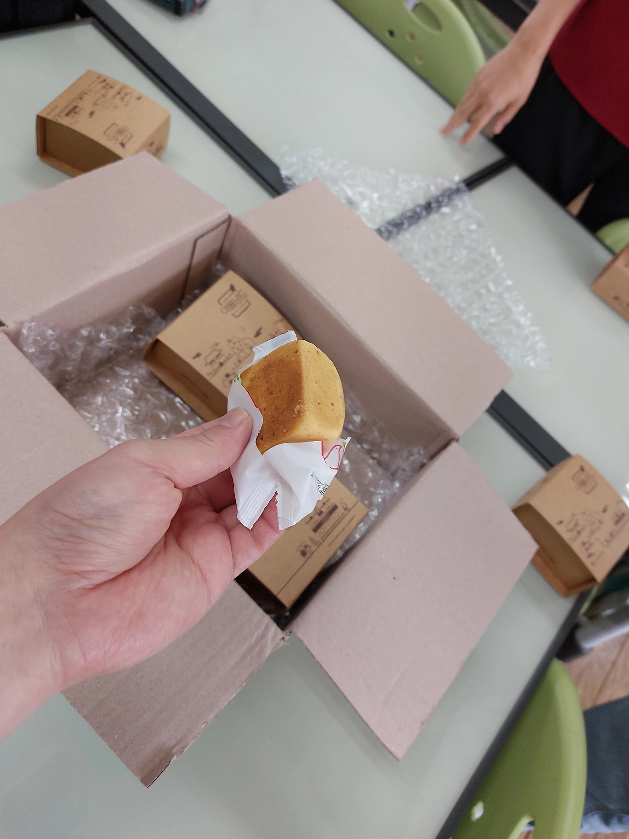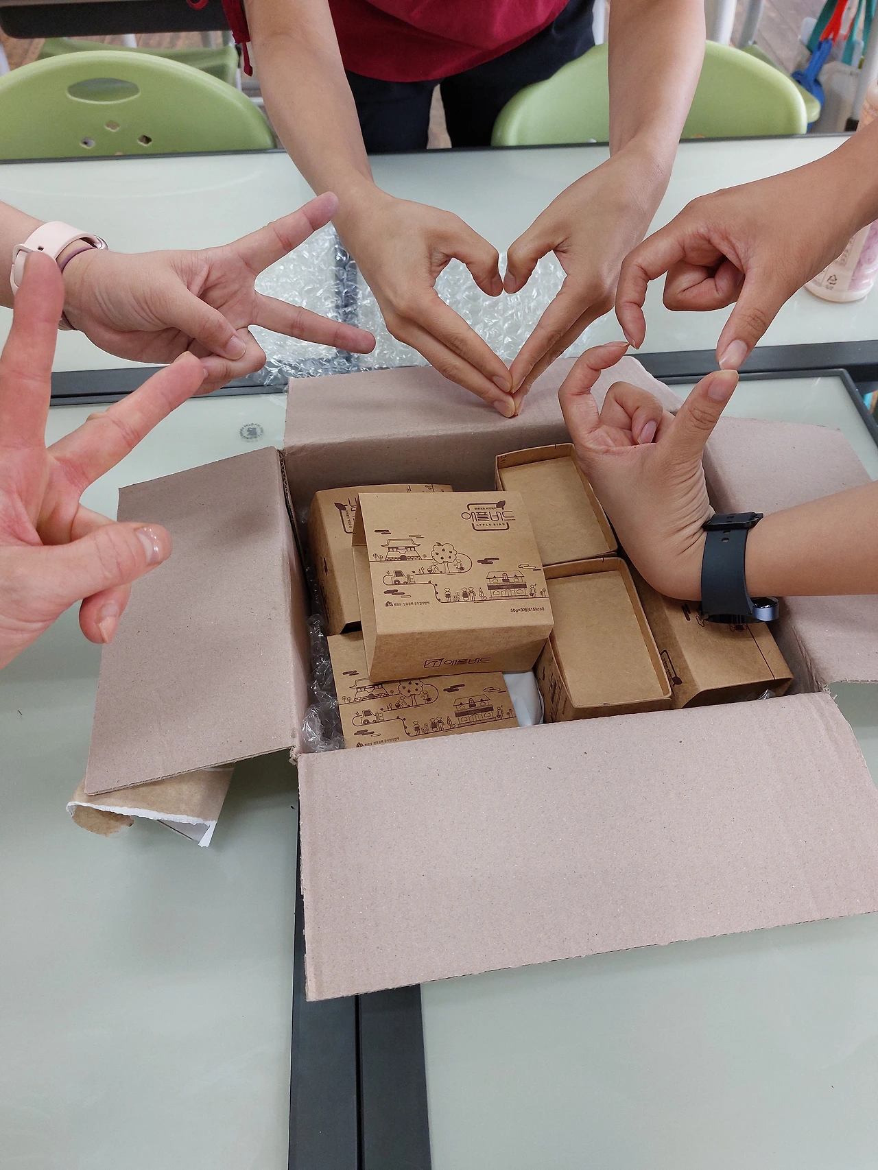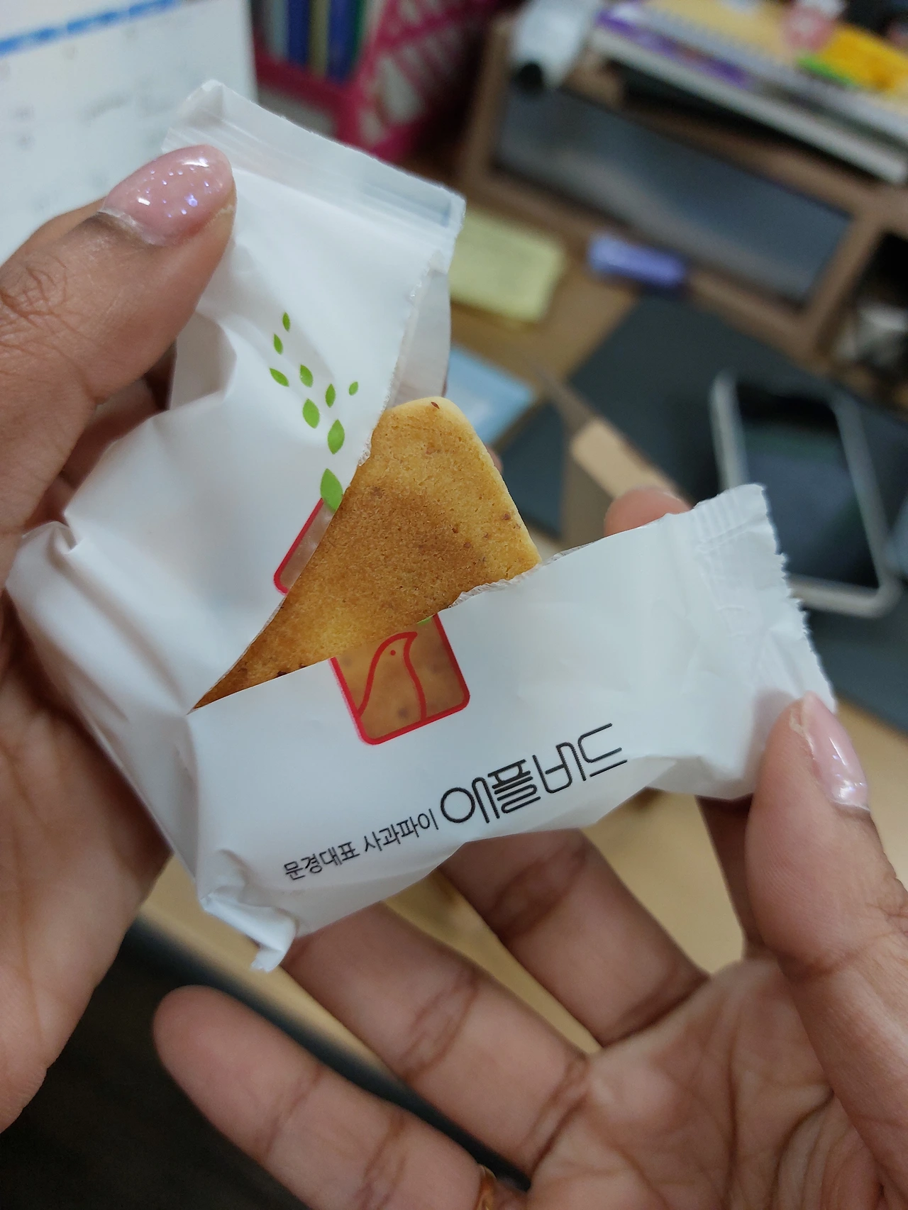 그리하여 간식 택배 앞으로 예전의 용사들이 다시 모였다. 천사선생님이 우리를 위해 배송시켜 준 달달구리는 과연 무엇일까? 두근두근 가슴을 부여잡고 개봉 박두. 아니 이것은, 바로바로 사과파이! 사실 이건 작년에 쌤이 우리에게 하나씩 맛보라고 선물했던 추억의 디저트였다. 오웅, 우리들이 좋아라 했었던 그 기억을 떠올리시곤 깜짝 선물을 하신 거다. 보고 싶은 우리 쌤, 이 따뜻한 마음 어떻게 보답하나요. 히잉, 눈물광광이다.