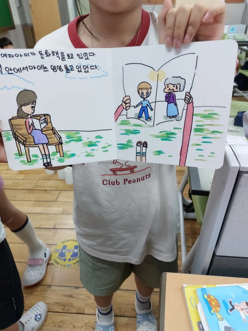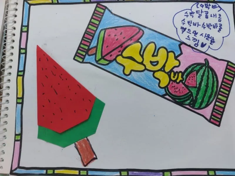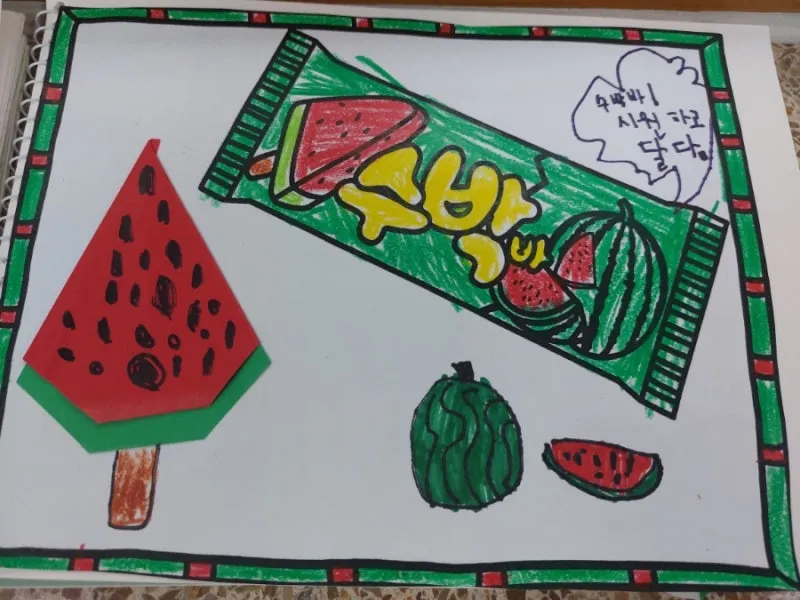 1학년 아이들이 색칠공부나 종이접기를 할 때의 순간을 옆에서 지켜보면 참 경이롭다. 집중을 하느라 꼬물대는 모습은 보기만 해도 사랑스럽다. 고사리같이 작은 손을 요리조리 움직이는 모습이라니. 말풍선에 쓴 글씨까지 너무 예쁘다. '수박이 시원하고 달다, ' 이거 어떻게 쓴 거니!