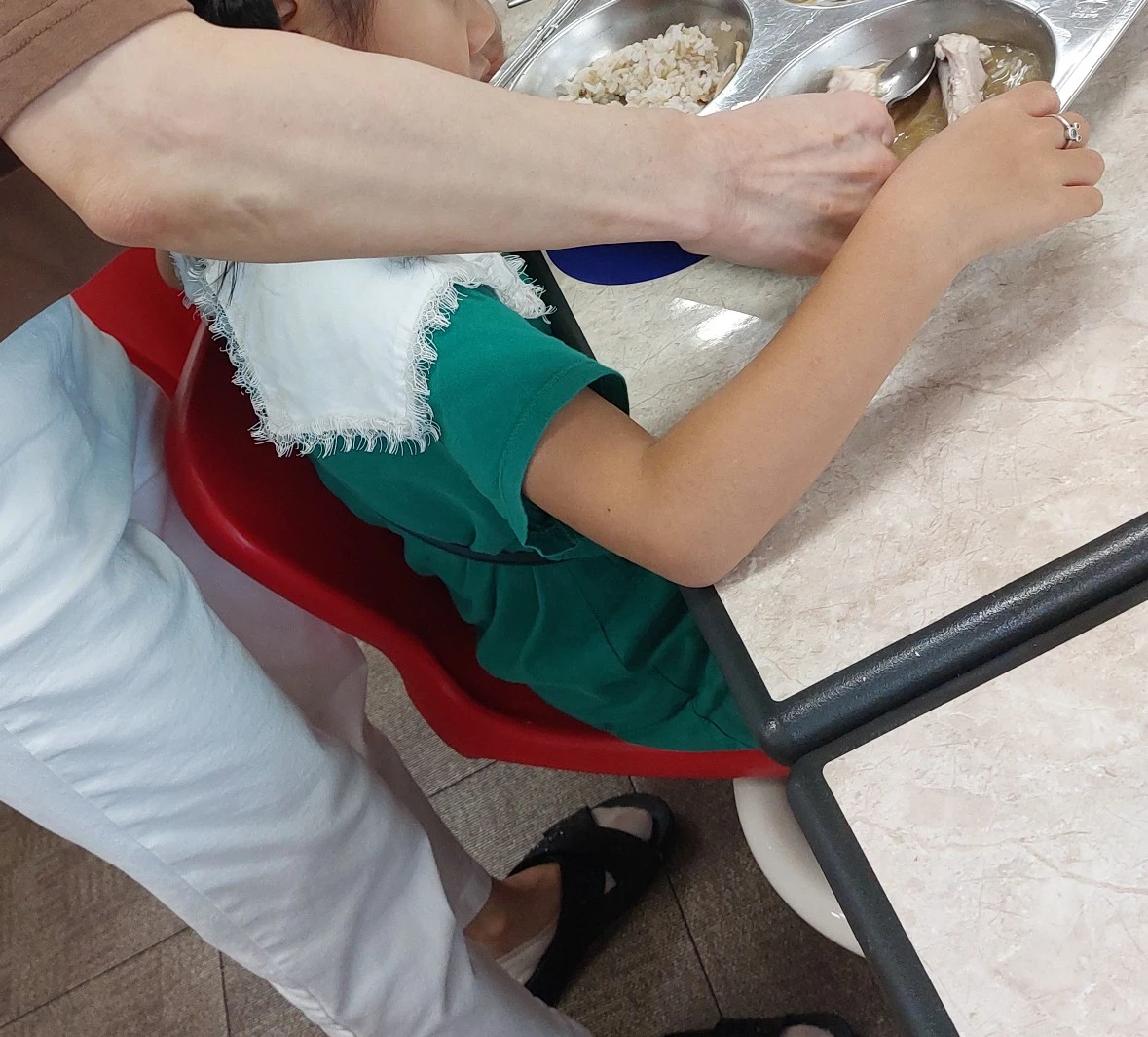 치킨 다리만 되어도 손으로 뼈를 잡고 어금니로 뜯겠지만, 백숙은 물에 빠진 고기라 손도 안 댄 아이들. 그래서 보다 못한 우리 쌤이 출동하신거다.