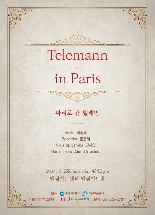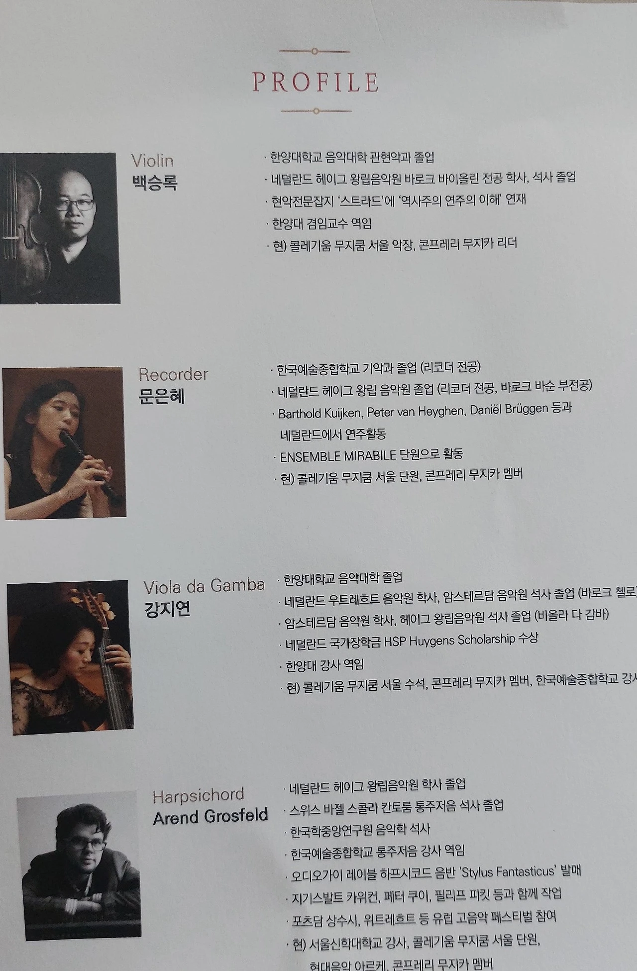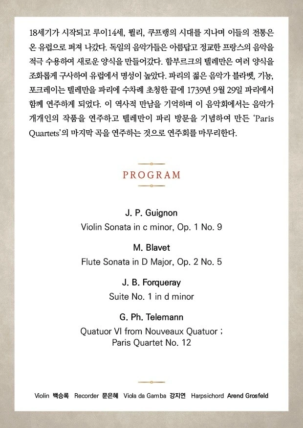 프랑스 친구들의 환대에 방긋방긋 웃었을 독일사람 텔레만을 상상하며 음악을 들어본다. 명장에게 자신이 작곡한 음악을 들려주던 프랑스 음악가들의 모습도 머릿속에 그려본다. 슬그머니 웃음이 나온다. '잉글리시맨 인 뉴욕'이 아니라 '텔레만 인 파리'가 공연 타이틀인 게 그런 이유가 있었다. 앙코르까지 넋 놓고 홀린 듯 듣다 사진 한 장도 제대로 못 찍었다. 그만큼 감동이었다.