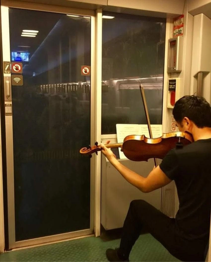 연습 자극 사진은 여기 하나 더 있다. KTX 열차 안에서 연습하는 리차드 용재 오닐의 공연 준비 연습 사진이다. 좁은 기차의 연결부 화장실 옆에서 히터 위를 보면대 삼아 연습을 하는 모습이라니. 진짜 연습할 환경이 안되어 연습을 못한다는 건 말도 안 되는 핑계다. 흑흑.저건 절대 설정샷이 아니다. 반성해라, 나 자신.