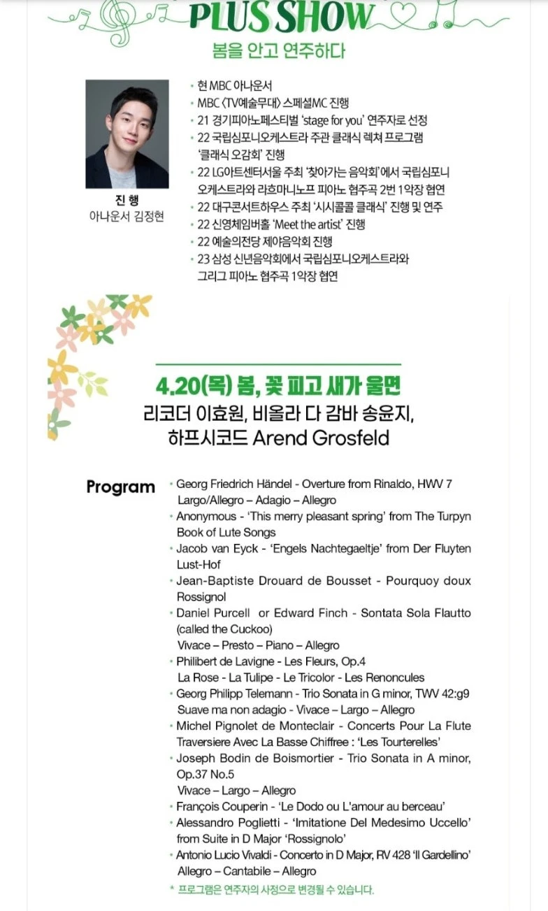작년 봄 심산 아트센터에서 김정현 아나운서를 직접 본 적이 있다. 그는 리코더 연주자 이효원 선생님의 공연에서 사회를 보았는데 깔끔한 진행 실력은 물론 중간에 드뷔시의 달빛을 피아노로 직접 연주도 했다. 마치 고등학교 음악선생님 마냥 관객들에게 자신이 알고 있는 모든 음악적 지식을 아낌없이 전수해 주고 싶어 하는 모습이었다. 1차원적 기쁨과 행복을 넘어 고차원적 삶의 만족을 추구하는 그의 모습이 참 멋지다. 내가 바라는 음악 찐덕후, 딜레탕트의 삶이다.