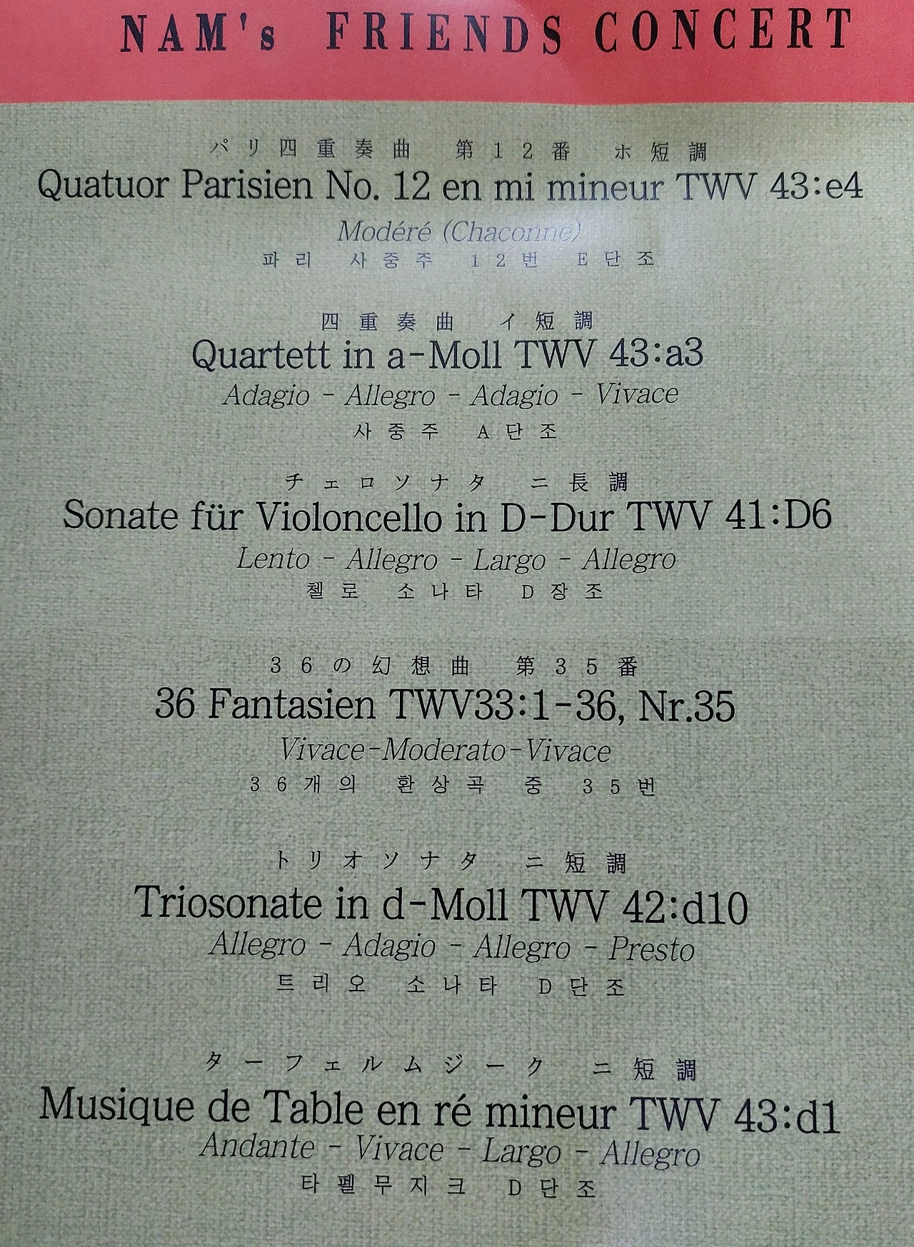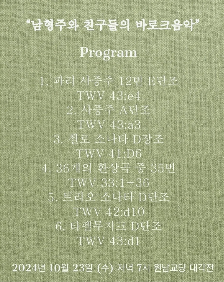 이번 '남형주와 친구들' 시즌 2 공연은 일본 고음악 콩쿠르 수상자들과 함께 했다. 이번 공연 프로그램 레퍼토리는 모두 바로크 시대 작곡가 텔레만의 곡들이다. 리코더 연주자 남형주와 텔레만의 조합, 이건 못 참지!