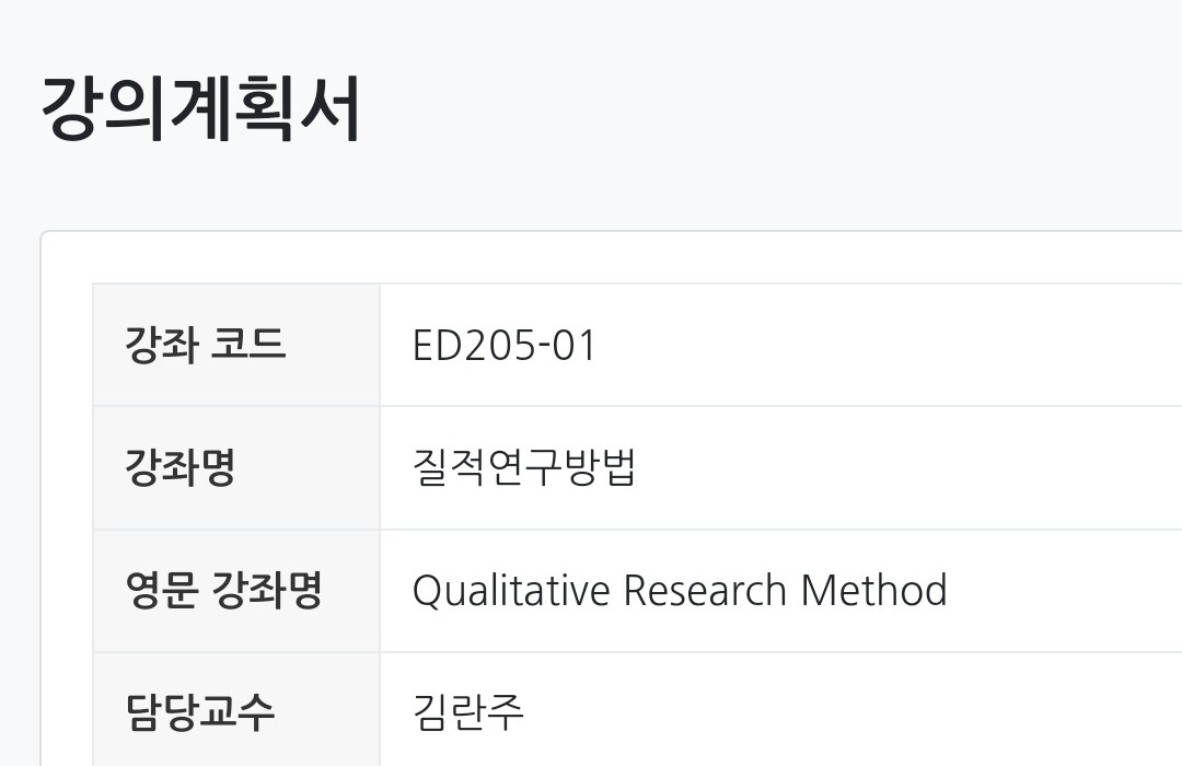 아이들을 맞이하는 1학기보다는 그래도 익숙해진 2학기가 더 낫겠지 싶어 등록한 교육대학원 수업. 이번 학기에는 질적연구방법 과목과 양적연구방법 과목 하나씩을 듣고 있다. 고난의 2학기가 될 것인가, 보람찬 2학기가 될 것인가 알 수가 없어 벌벌 떨고 있었는데 다행히 두 과목 교수님 다 정말 좋으시다.