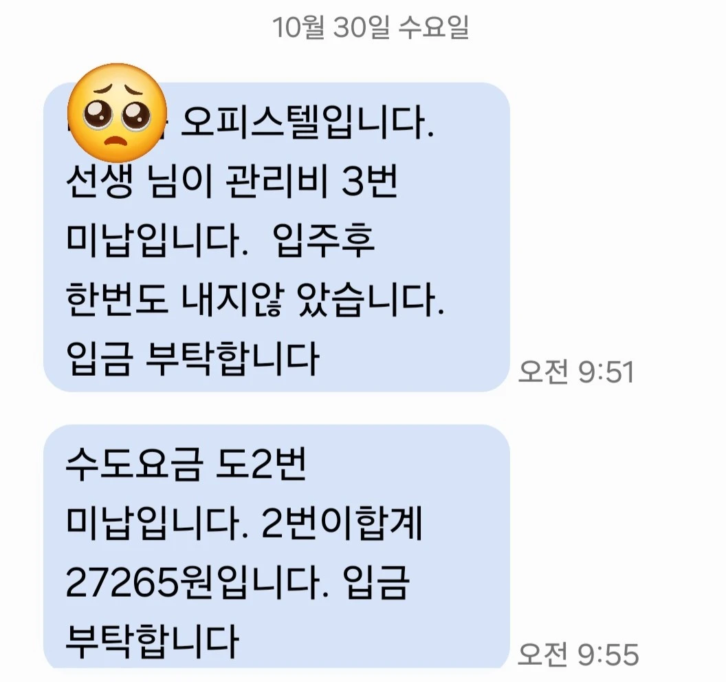원어민 선생님이 살고 있는 오피스텔 집주인으로부터 문자가 왔다. 관리비 3회, 수도요금 2회가 미납 되었다는 내용이다. 이게 무슨 말인가. 갑자기 머리가 지끈거리기 시작했다.