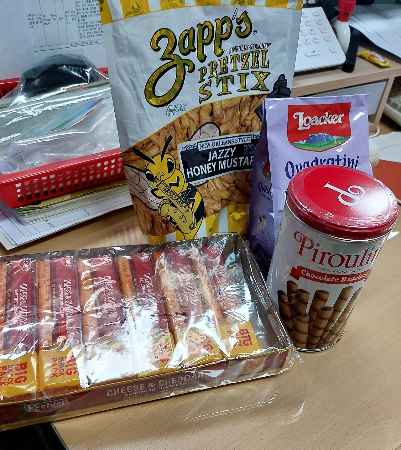 해서 박장대소를 하며 함께 웃었다. 얼마 전 쌤 언니가 한국에 여행 온 적이 있는데 그때 미국 과자도 함께 사 왔다고 한다. 그 덕분에 우리도 과자파티를 했다.