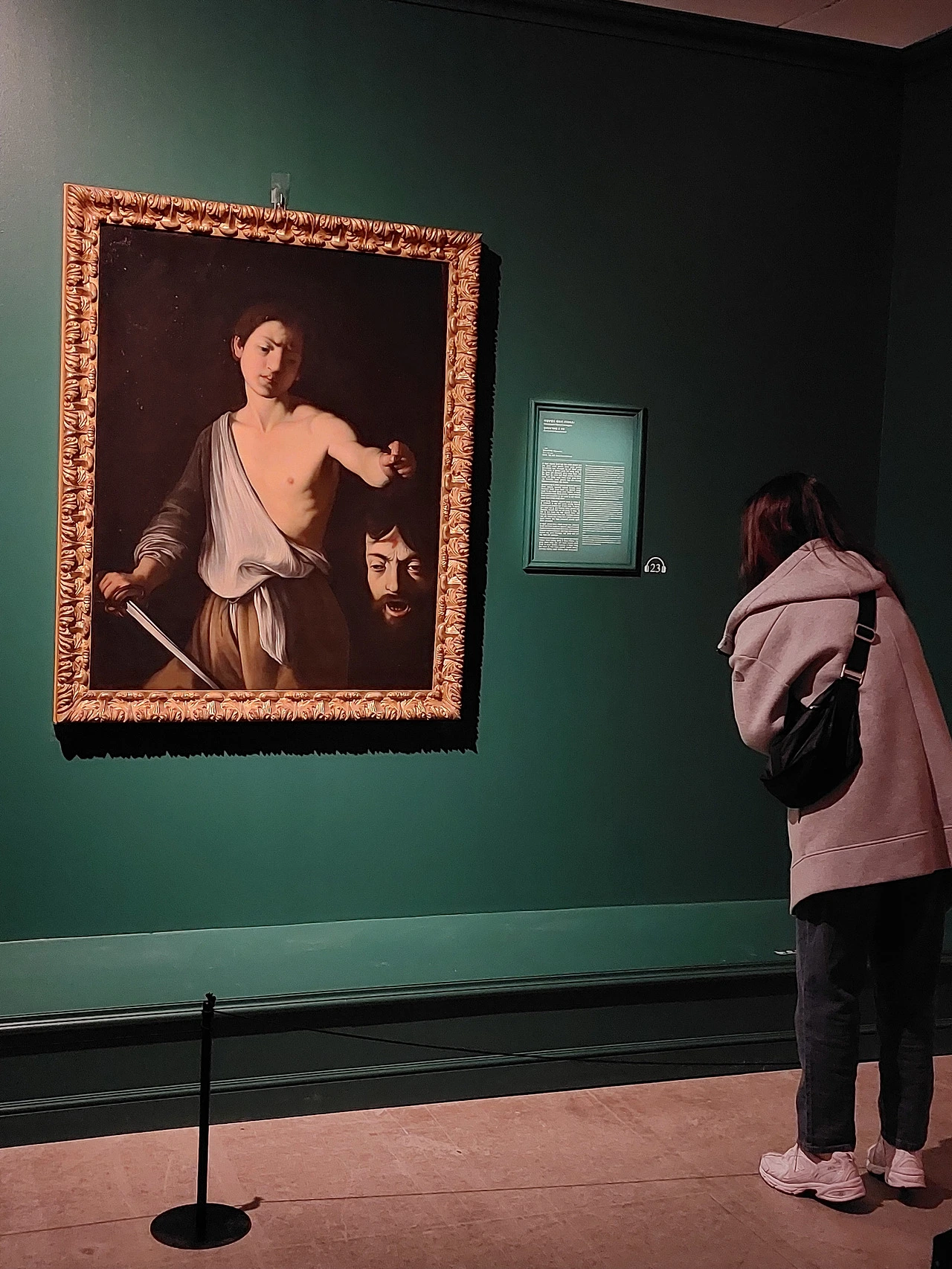 유명한 이 작품 앞에 사람들이 벌떼같이 모여들어 사진 찍기조차 어려웠다. 이번 전시에서 주인공은 누가 뭐래도 이 작품이었다. 실제로 이 작품이 제일 끝 전시물이라 바로 옆 방은 카라바조의 생애를 연대기 순으로 설명하는 출구였다. 그래서 바로크 음악이 계속 흘러나왔다. 귀에 익은 멜로디는 바로 텔레만 비올라 협주곡이었다. 진짜 끝인건가 아쉽다 싶어 그림 앞에서 한참을 서성였다.
