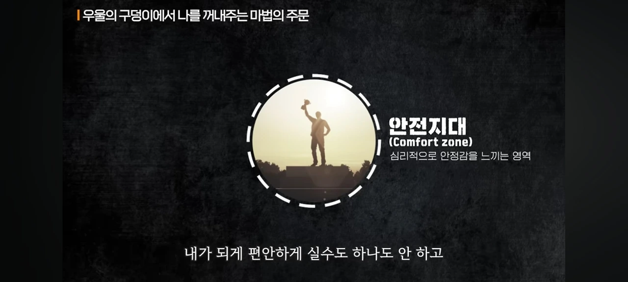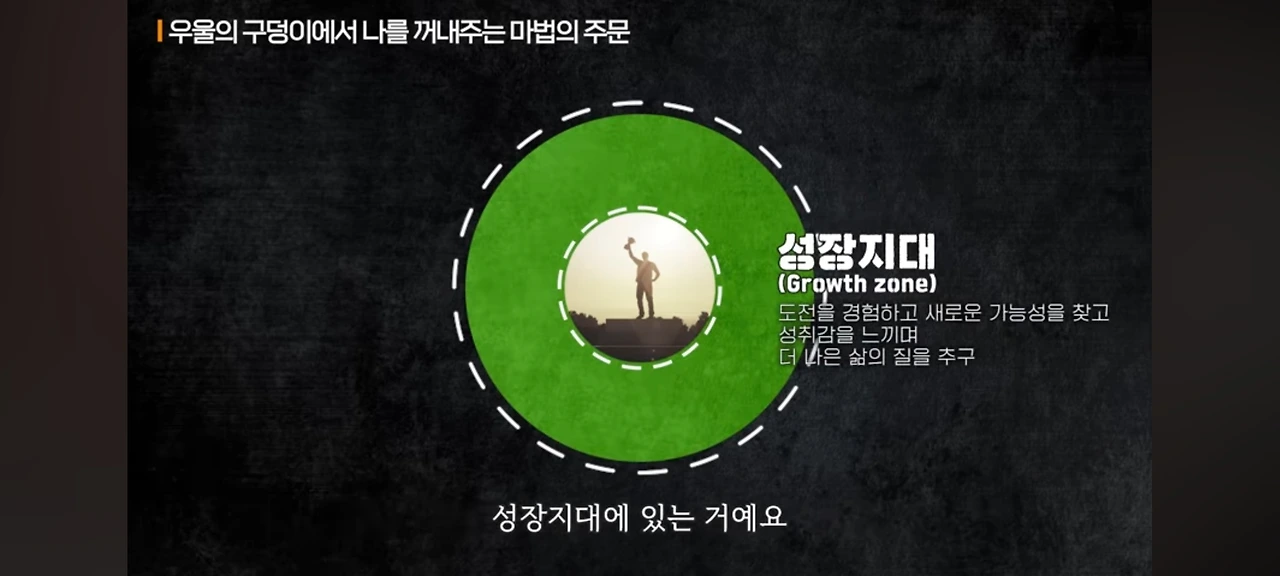 1. 우리는 늘 경쟁 속에 살고 있죠. 그래서 내가 1등한다, 잘 한다 하는 안전지대가 있어요. 그런 걸 '컴포트 존'이라고 합니다. 헌데 그 밖은 '디스컴포트 존'일까요?아닙니다. 성장지대 groth zone이에요.