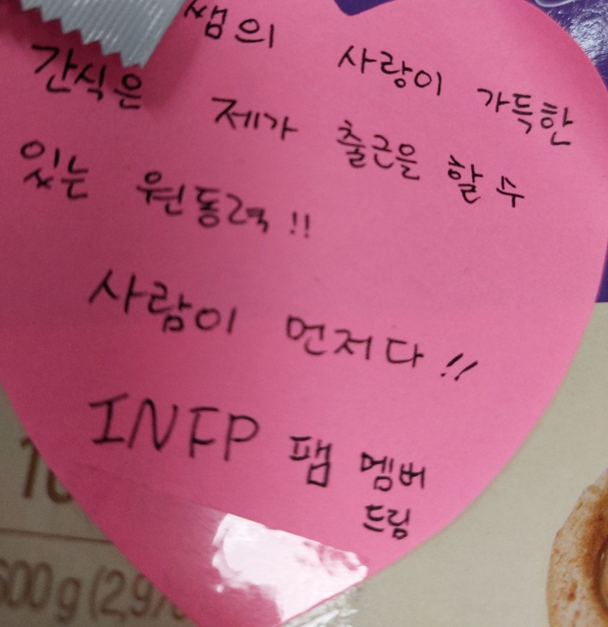 소녀 감성 인프피들은 손글씨도 좋아하니 간식과 포스트잇의 조합은 언제나 우리들 차지다. ㅋㅋㅋ 인프피 패밀리들은 사랑을 음식으로 고백하니 말이다.