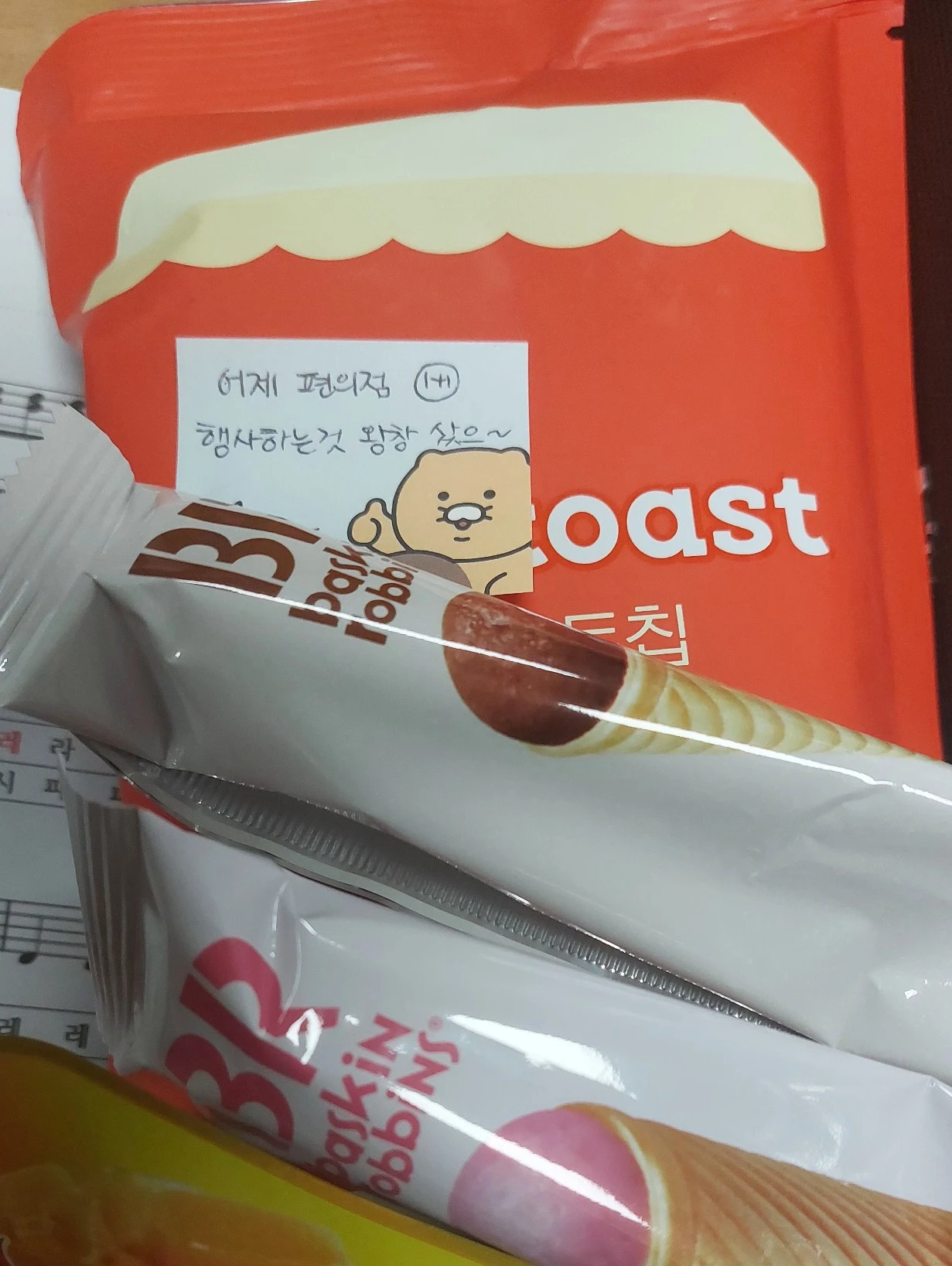 자기 이름을 안 썼지만 글씨만 봐도 누군지 나는 다 알 수 있지롱! 편의점을 털어왔다는 내 친구는 신제품은 그냥 넘어가지 못하는 얼리어답터, 아니 얼리시식단 정예멤버다. 자기가 먹은 새로운 맛을 내게도 꼭 보여주겠다는 강한 의지가 엿보인다.
