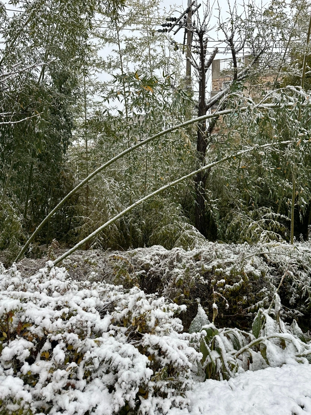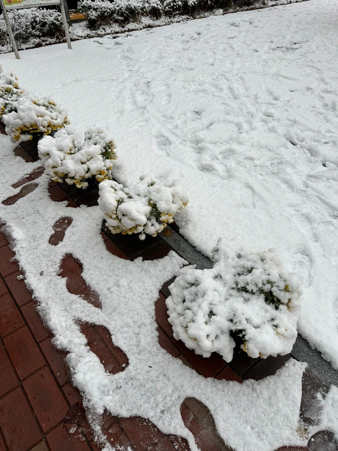 노란 국화 화분위에도 소담히 내려앉은 눈. 보통 나뭇잎이 다 떨어진 앙상한 가지에 눈이 내리는데 이런 경광은 처음이라 낯설지만 재미있다. 나뭇잎 위로 내린 눈이 무거워 줄기가 휘어진 가지를 보니 여기가 꿈과 환상의 세계로 들어가는 입구 같기도 하다.